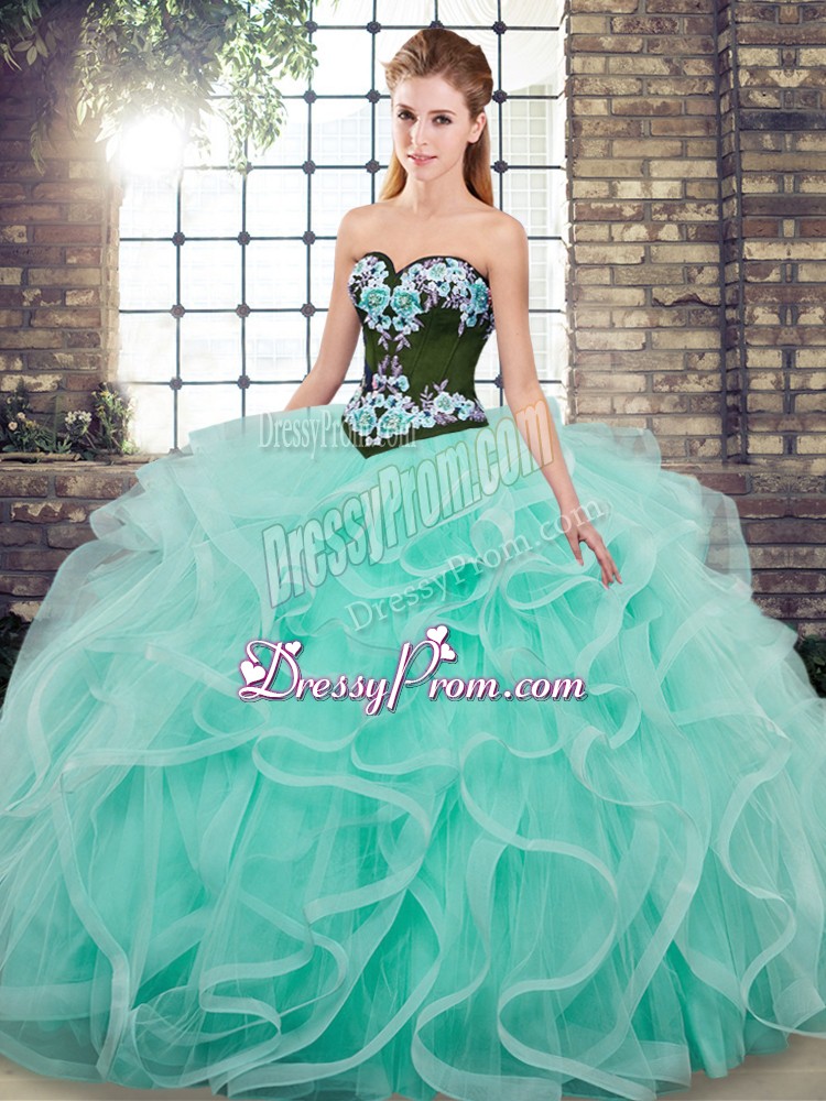 Neckline : Sweetheart Shown Color : Aqua Blue Silhouette : Ball Gowns Sleeve Length : sleeveless Back Detail : Lace up Fabric : Tulle Embellishment : Embroidery,Ruffles Occasion : Military Ball,Sweet 16,Quinceanera Season : Spring,Summer,Fall,Winter