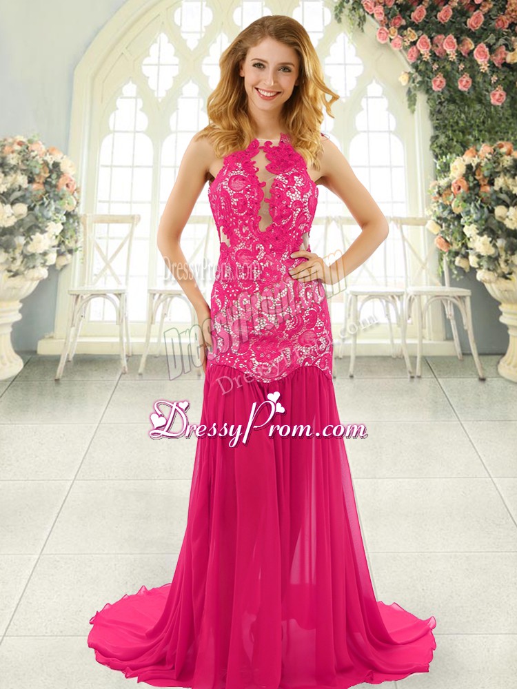 Neckline : ScoopShown Color : Hot PinkSilhouette : MermaidSleeve Length : sleevelessBack Detail : BacklessFabric : ChiffonEmbellishment : LaceOccasion : Prom,PartySeason : Spring,Summer,Fall,Winter