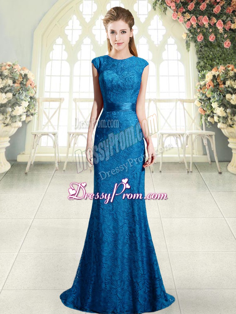 Neckline : ScoopShown Color : BlueSilhouette : MermaidSleeve Length : cap sleevesBack Detail : BacklessEmbellishment : Beading,LaceOccasion : Prom,PartySeason : Spring,Summer,Fall,Winter