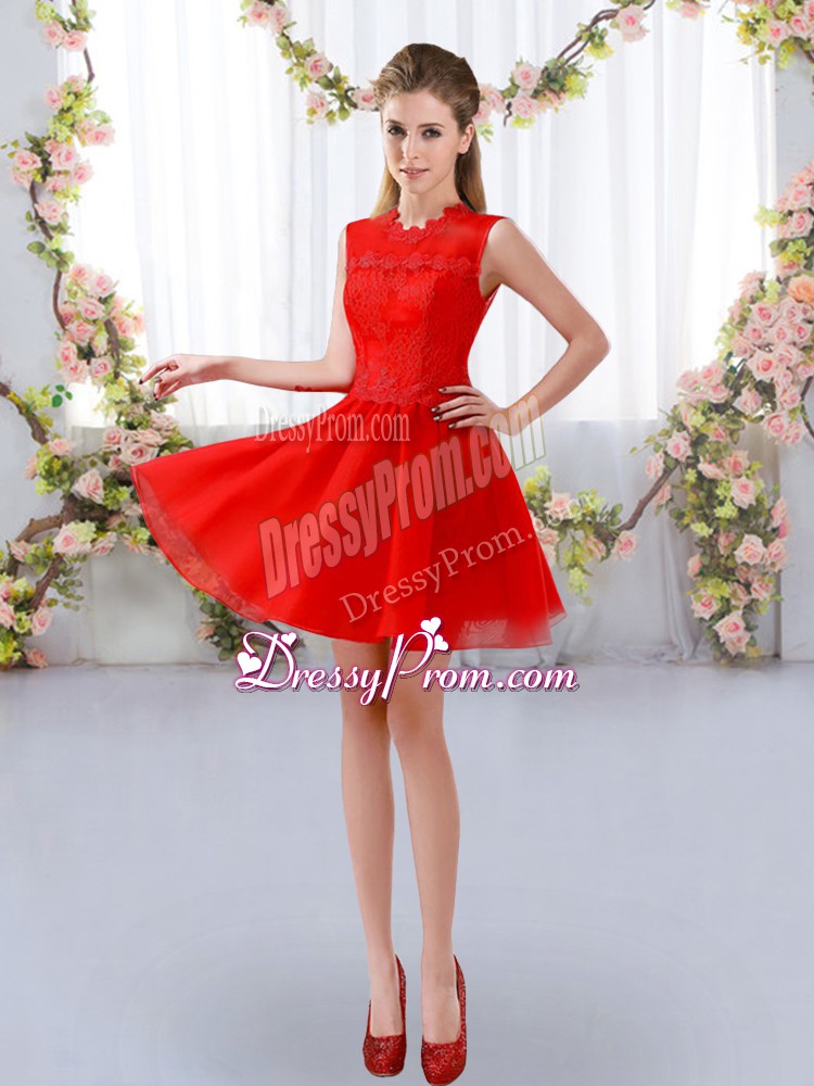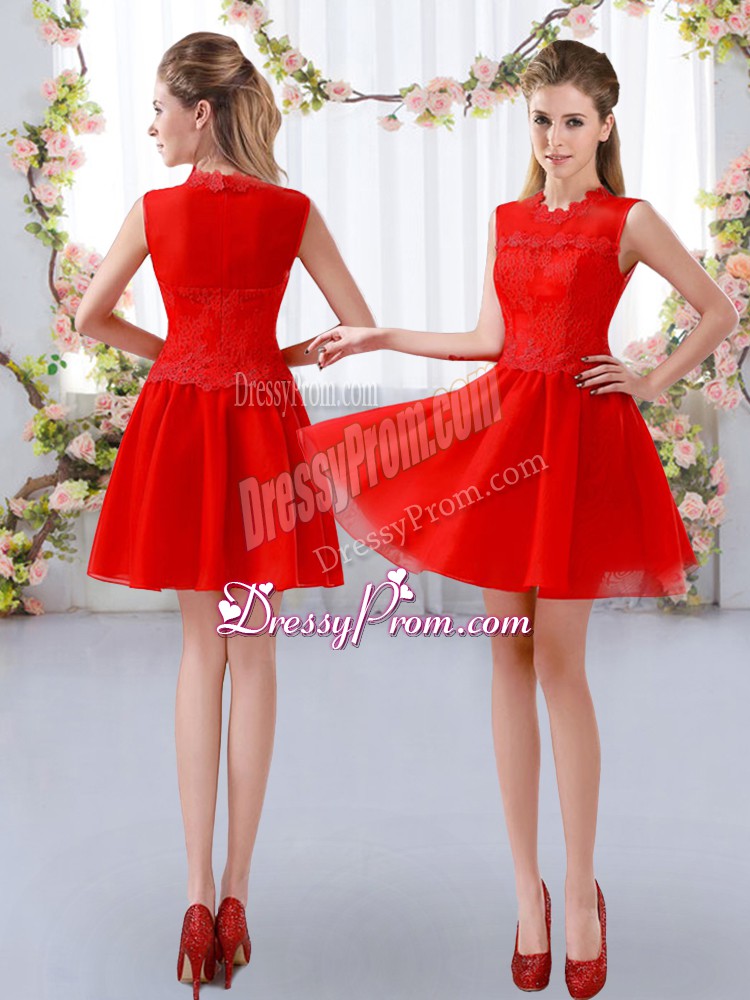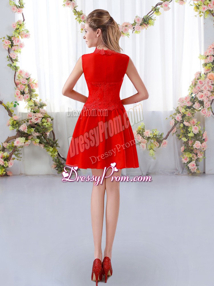 Neckline : High-neckShown Color : RedSilhouette : EmpireSleeve Length : sleevelessHemline : mini lengthBack Detail : ZipperFabric : ChiffonEmbellishment : LaceOccasion : Prom,Party,Wedding PartySeason : Spring,Summer,Fall