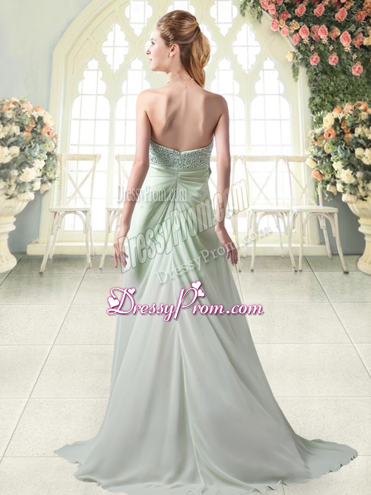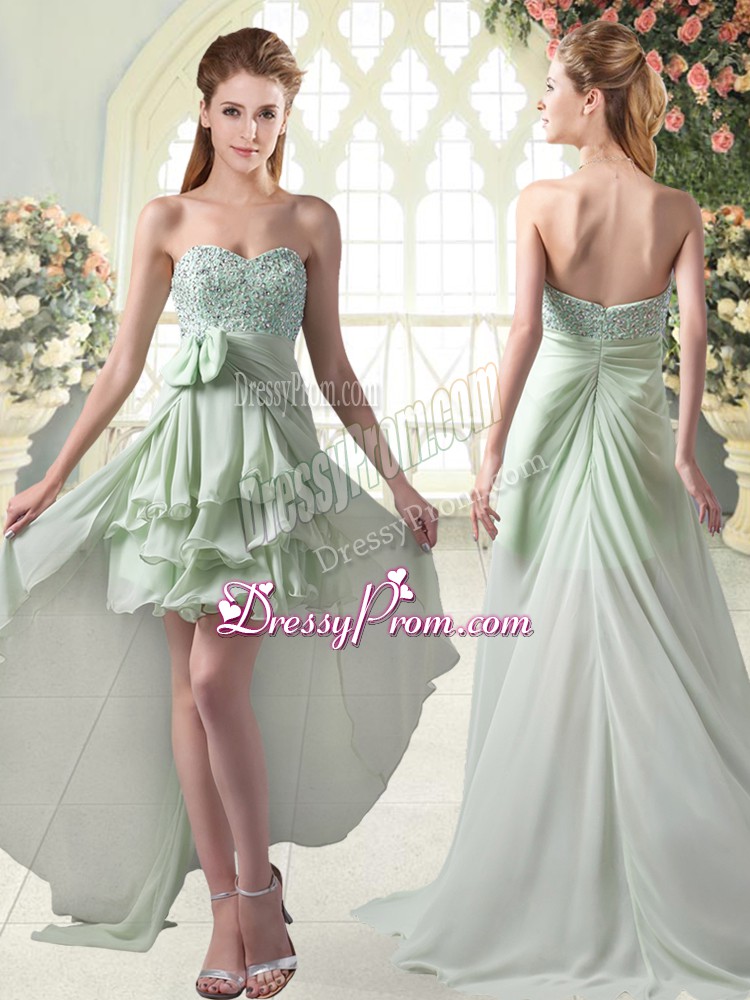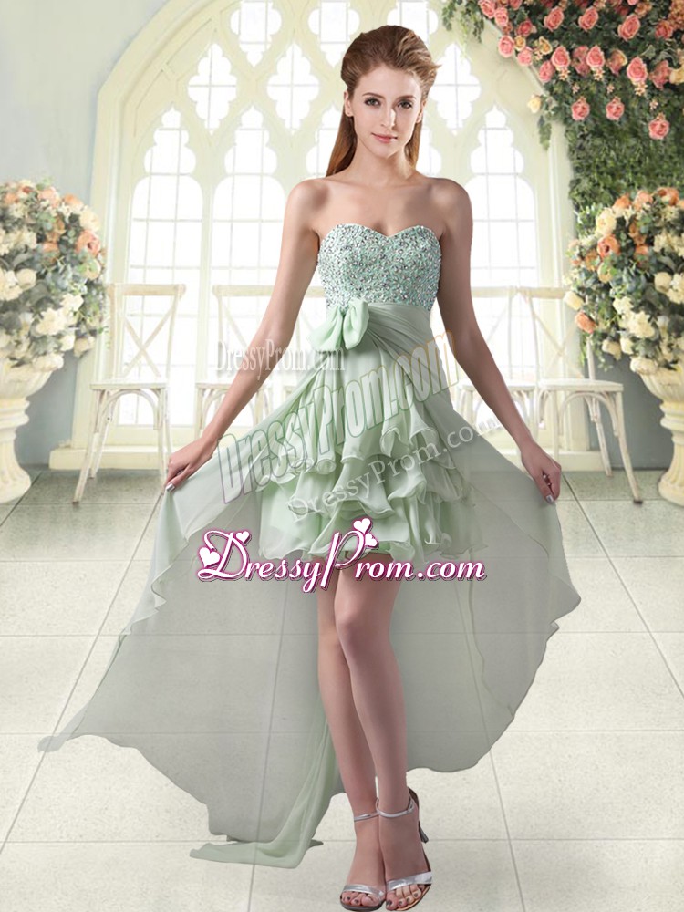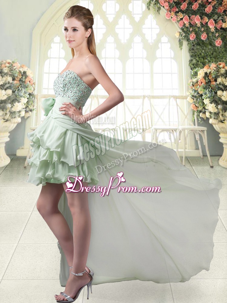 Neckline : SweetheartShown Color : Apple GreenSilhouette : A-lineSleeve Length : sleevelessHemline : high lowBack Detail : ZipperFabric : ChiffonEmbellishment : Beading,Ruffled LayersOccasion : Prom,PartySeason : Spring,Summer,Fall,Winter