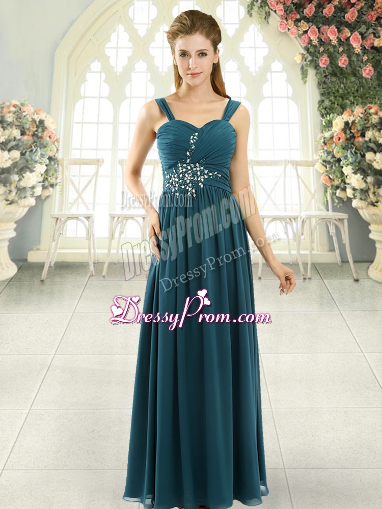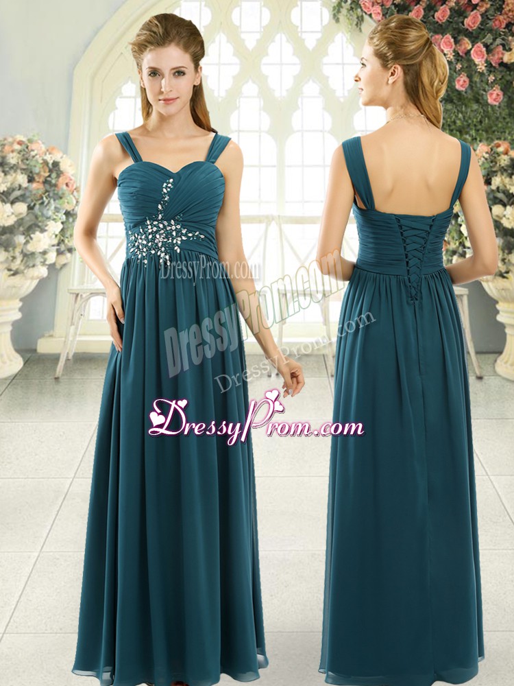 Neckline : Spaghetti strapsShown Color : Teal Silhouette : EmpireSleeve Length : sleevelessHemline : floor lengthBack Detail : Lace upFabric : ChiffonEmbellishment : Beading,RuchingOccasion : Prom,PartySeason : Spring,Summer,Fall,Winter