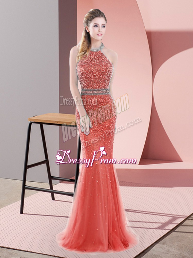 Neckline : Halter topShown Color : RedSilhouette : MermaidSleeve Length : sleevelessBack Detail : BacklessFabric : TulleEmbellishment : BeadingOccasion : Prom,PartySeason : Spring,Summer,Fall,Winter