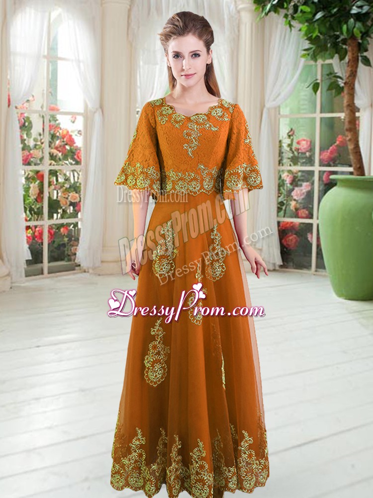 Neckline : ScallopedShown Color : OrangeSilhouette : A-lineSleeve Length : half sleevesHemline : floor lengthBack Detail : Lace upFabric : TulleEmbellishment : LaceOccasion : Prom,PartySeason : Spring,Summer,Fall,Winter