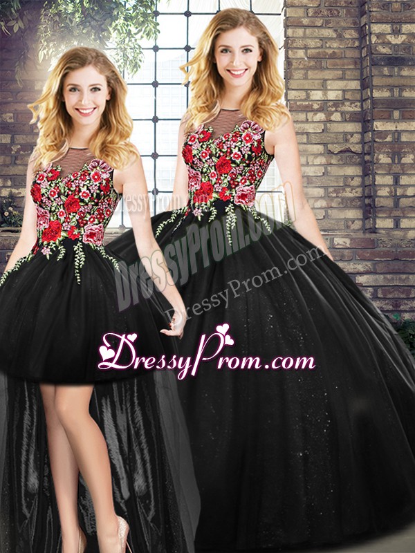 Neckline : ScoopShown Color : BlackSilhouette : Ball GownsSleeve Length : sleevelessHemline : floor lengthBack Detail : ZipperEmbellishment : EmbroideryOccasion : Military Ball,Sweet 16,QuinceaneraSeason : Spring,Summer,Fall,Winter