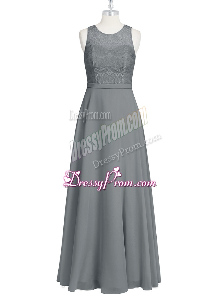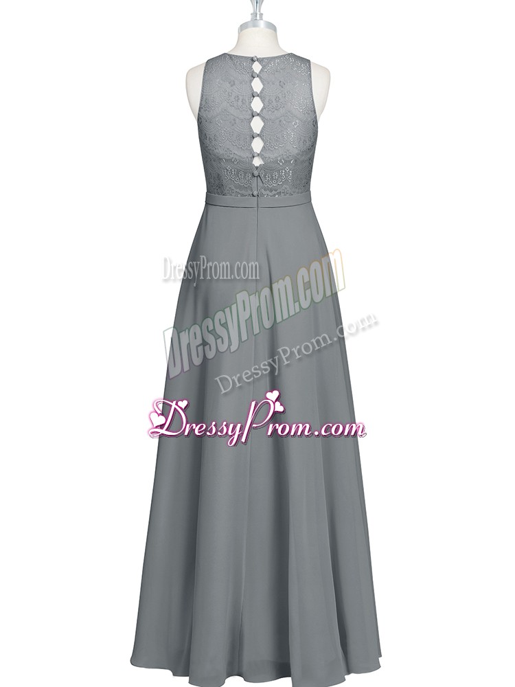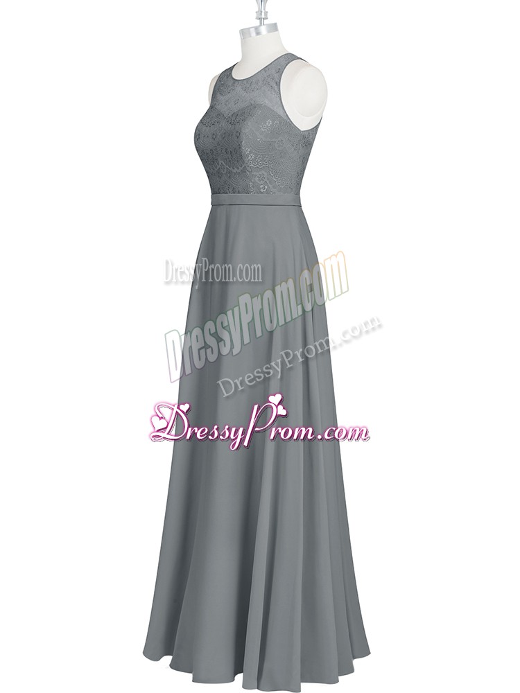 Neckline : ScoopShown Color : GreySilhouette : EmpireSleeve Length : sleevelessHemline : floor lengthBack Detail : ZipperFabric : ChiffonEmbellishment : Lace,Appliques,BeltOccasion : Prom,Party,Military BallSeason : Spring,Summer,Fall,Winter