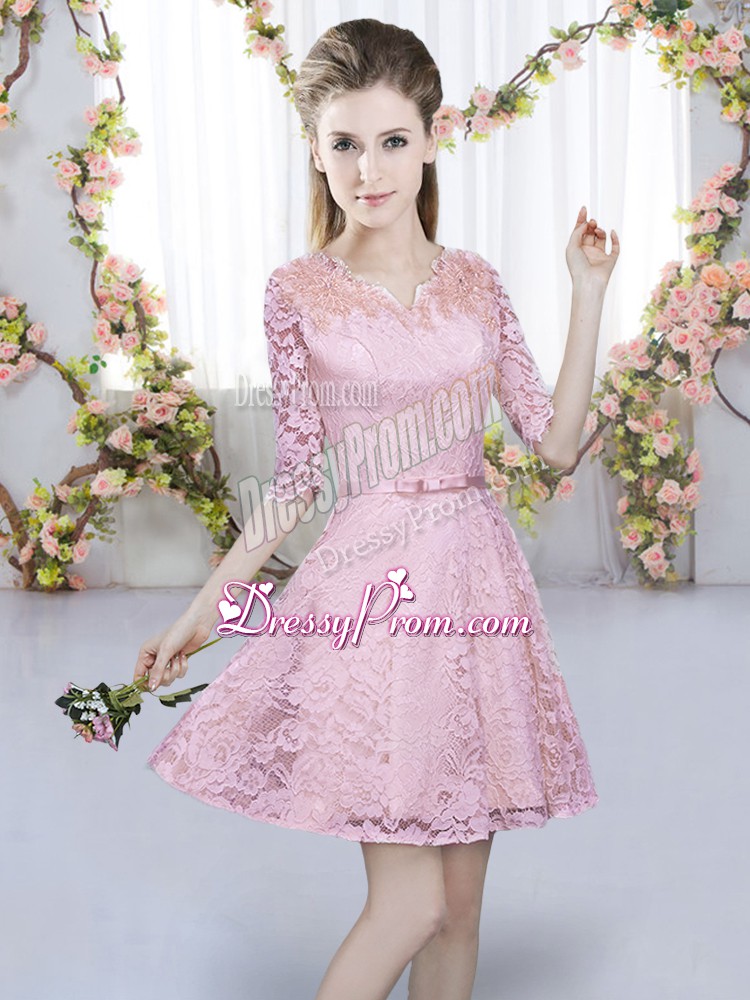 Neckline : V-neckShown Color : Pink Silhouette : A-lineSleeve Length : half sleevesHemline : mini lengthBack Detail : ZipperFabric : LaceEmbellishment : BeltOccasion : Prom,PartySeason : Spring,Summer,Fall
