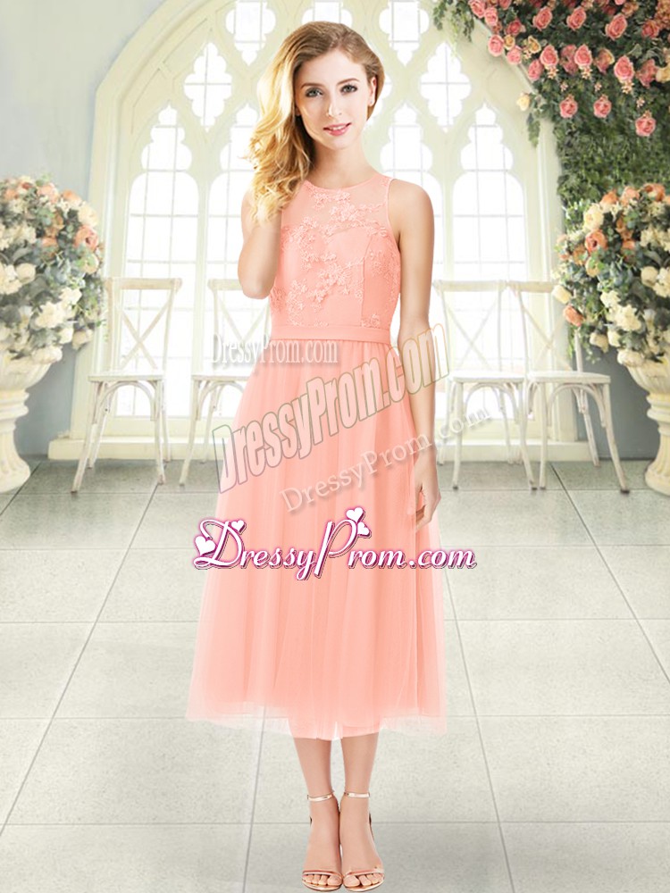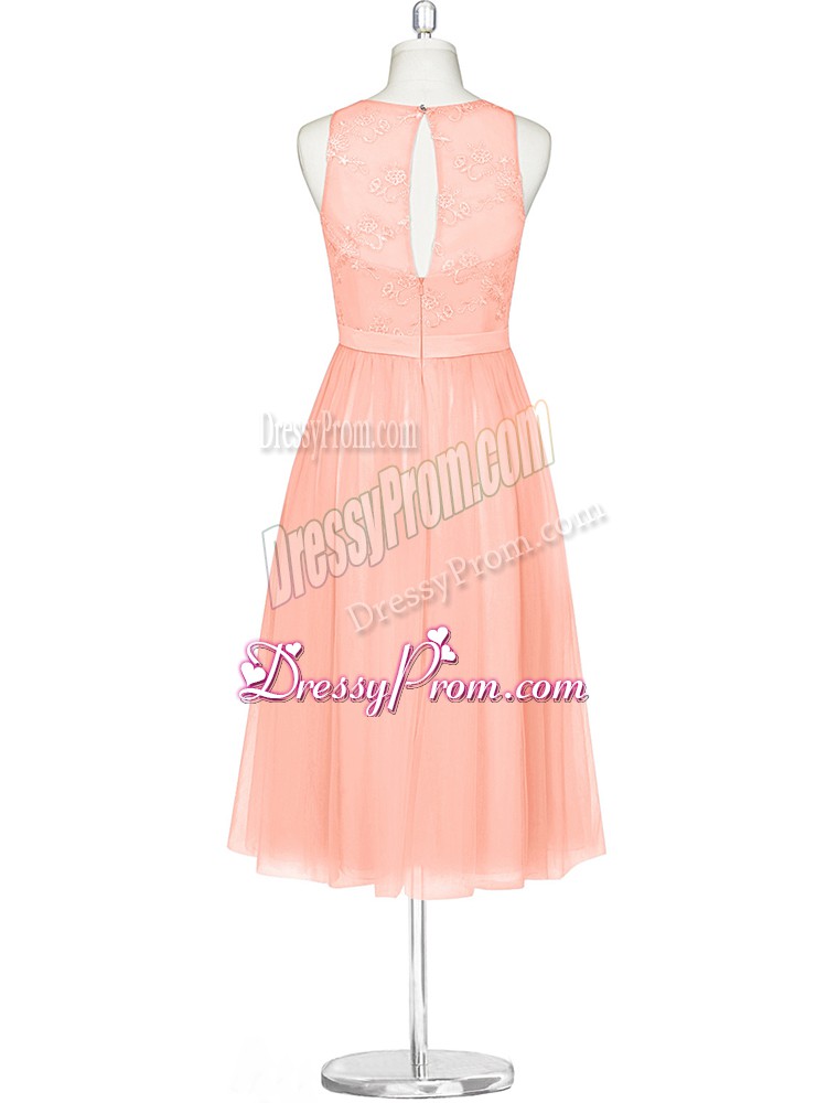 Neckline : ScoopShown Color : PeachSilhouette : EmpireSleeve Length : sleevelessHemline : tea lengthBack Detail : ZipperFabric : ChiffonEmbellishment : LaceOccasion : Prom,PartySeason : Spring,Summer,Fall,Winter