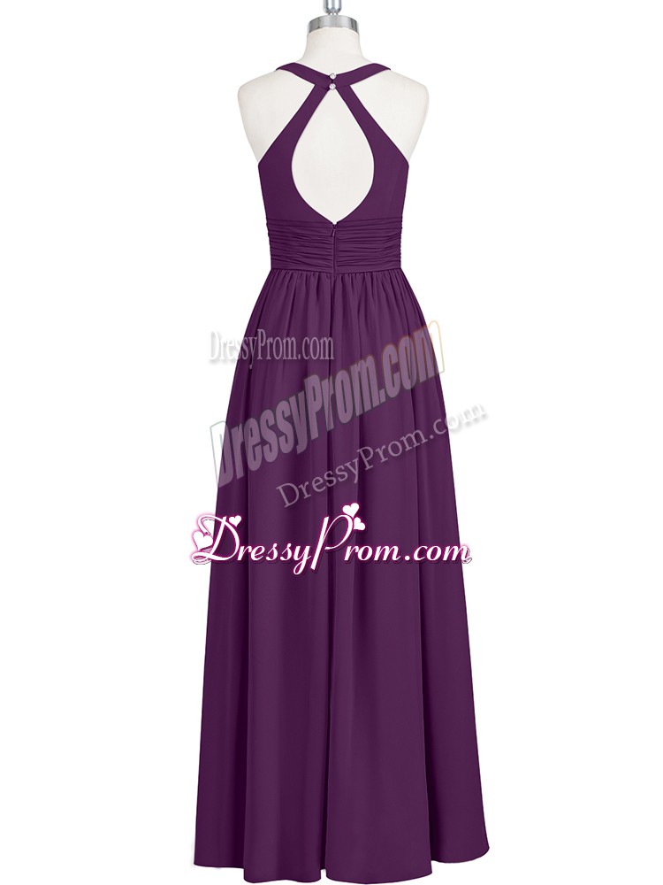 Neckline : V-neckShown Color : Eggplant PurpleSilhouette : A-lineSleeve Length : sleevelessHemline : floor lengthBack Detail : ZipperFabric : ChiffonEmbellishment : RuchingOccasion : Prom,PartySeason : Spring,Summer,Fall,Winter