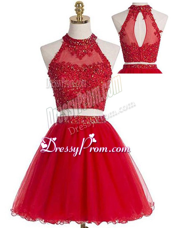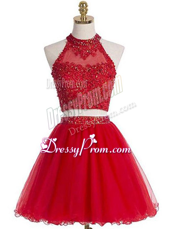 Neckline : Halter topShown Color : RedSilhouette : Two PiecesSleeve Length : sleevelessHemline : mini lengthBack Detail : ZipperFabric : TulleEmbellishment : Beading,AppliquesOccasion : Prom,Party,Military BallSeason : Spring,Summer,Fall,Winter