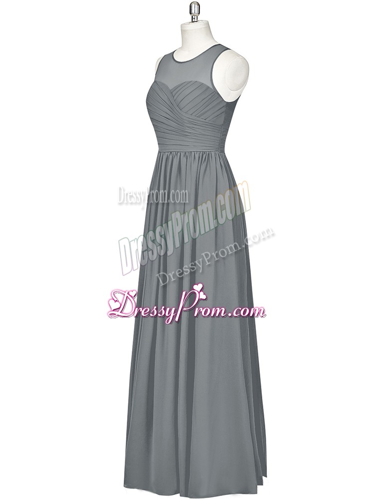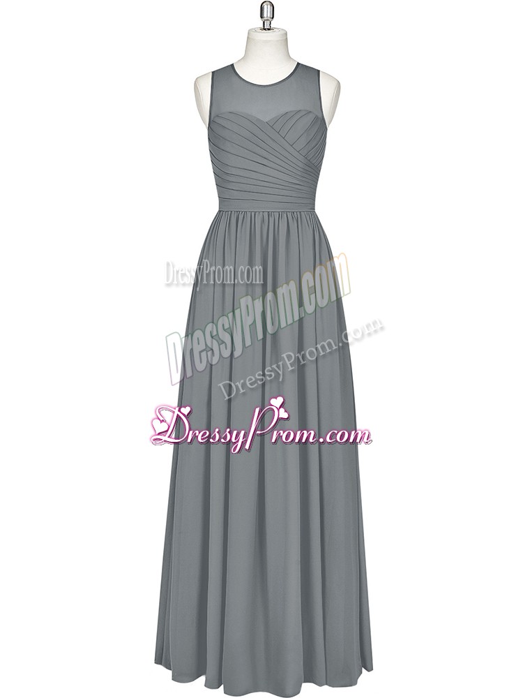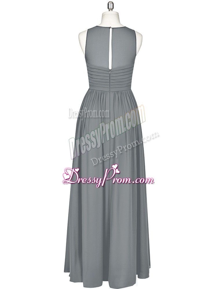 Neckline : ScoopShown Color : GreySilhouette : EmpireSleeve Length : sleevelessHemline : floor lengthBack Detail : ZipperFabric : ChiffonEmbellishment : RuchingOccasion : Prom,Party,Military BallSeason : Spring,Summer,Fall,Winter
