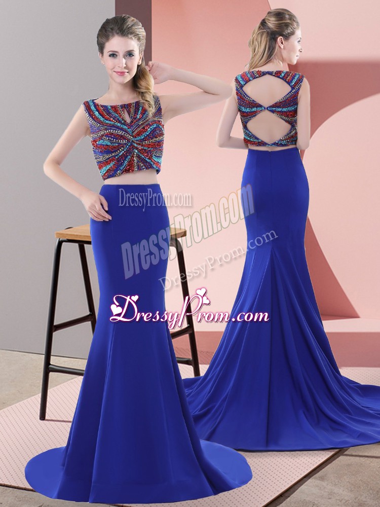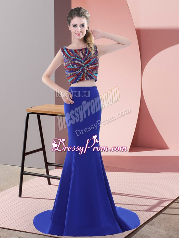 Two Pieces Sleeveless Royal Blue Dress for Prom Sweep Train Lace Up
