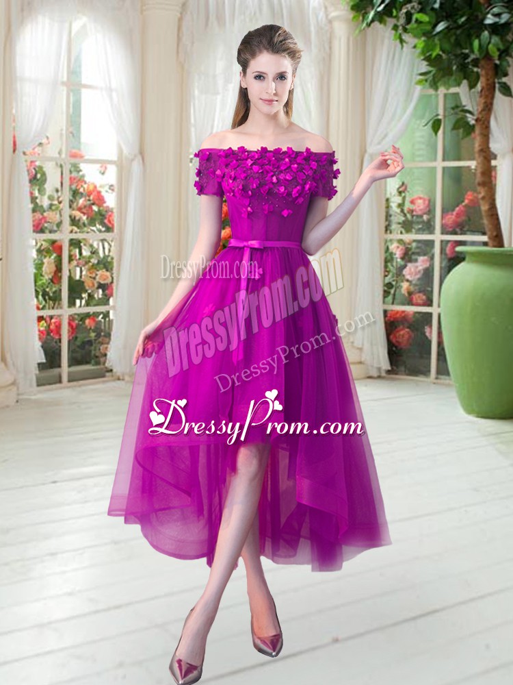 Neckline : Off the shoulder Shown Color : Fuchsia Silhouette : A-line Sleeve Length : short sleeves Hemline : high low Back Detail : Lace up Fabric : Tulle Embellishment : Appliques Occasion : Prom,Party Season : Spring,Summer,Fall,Winter