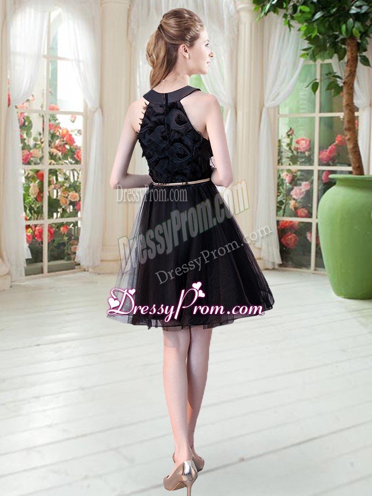 Neckline : ScoopShown Color : BlackSilhouette : A-lineSleeve Length : sleevelessHemline : mini lengthBack Detail : ZipperFabric : TulleEmbellishment : BeltOccasion : Prom,PartySeason : Spring,Summer,Fall