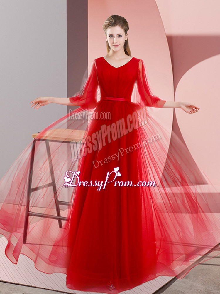 Neckline : V-neckShown Color : RedSilhouette : A-lineSleeve Length : long sleevesHemline : floor lengthBack Detail : Lace upFabric : TulleEmbellishment : BeadingOccasion : Prom,PartySeason : Spring,Summer,Fall,Winter