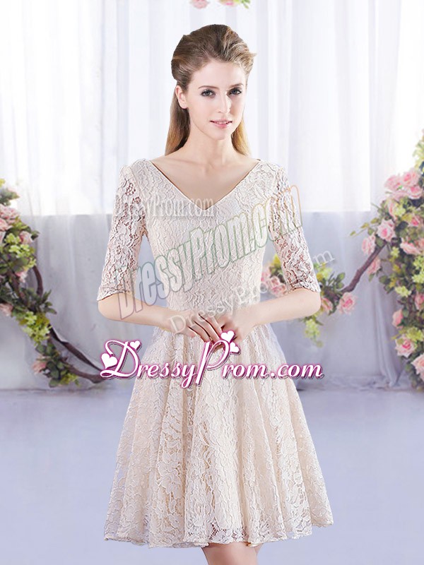 Neckline : V-neckShown Color : ChampagneSilhouette : EmpireSleeve Length : half sleevesHemline : mini lengthBack Detail : Lace upEmbellishment : LaceOccasion : Prom,Party,Wedding PartySeason : Spring,Summer,Fall