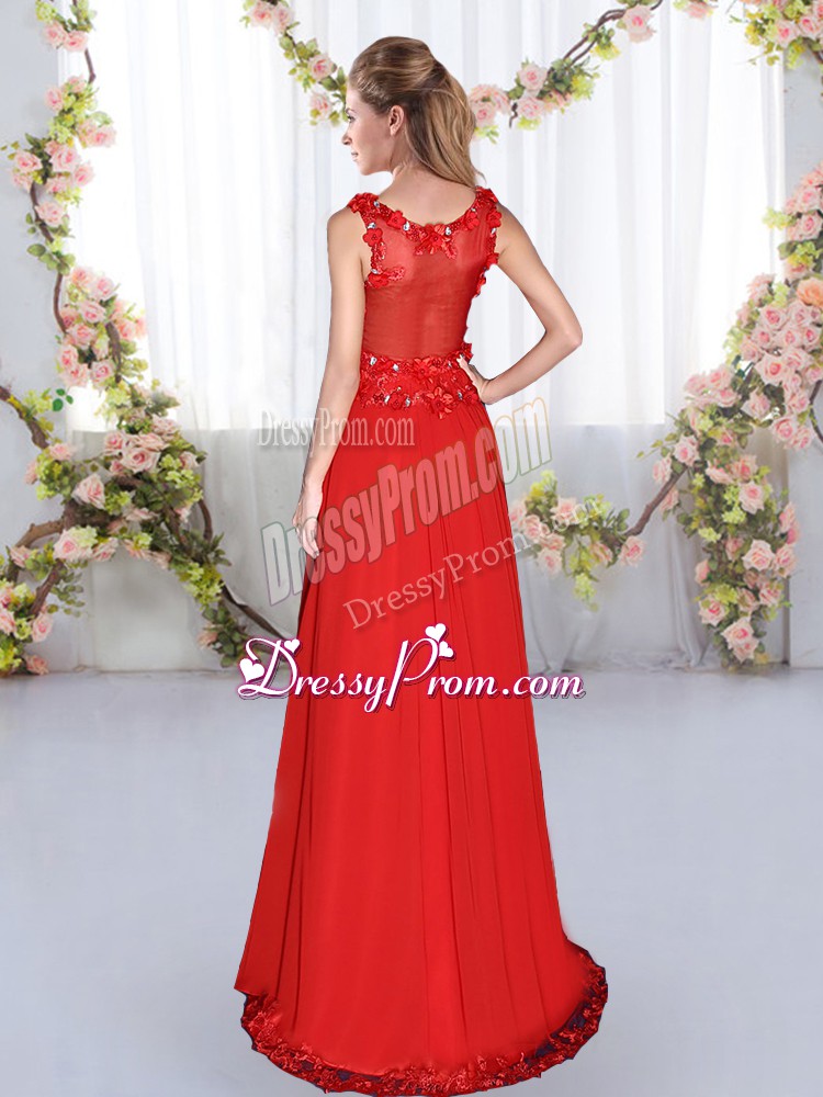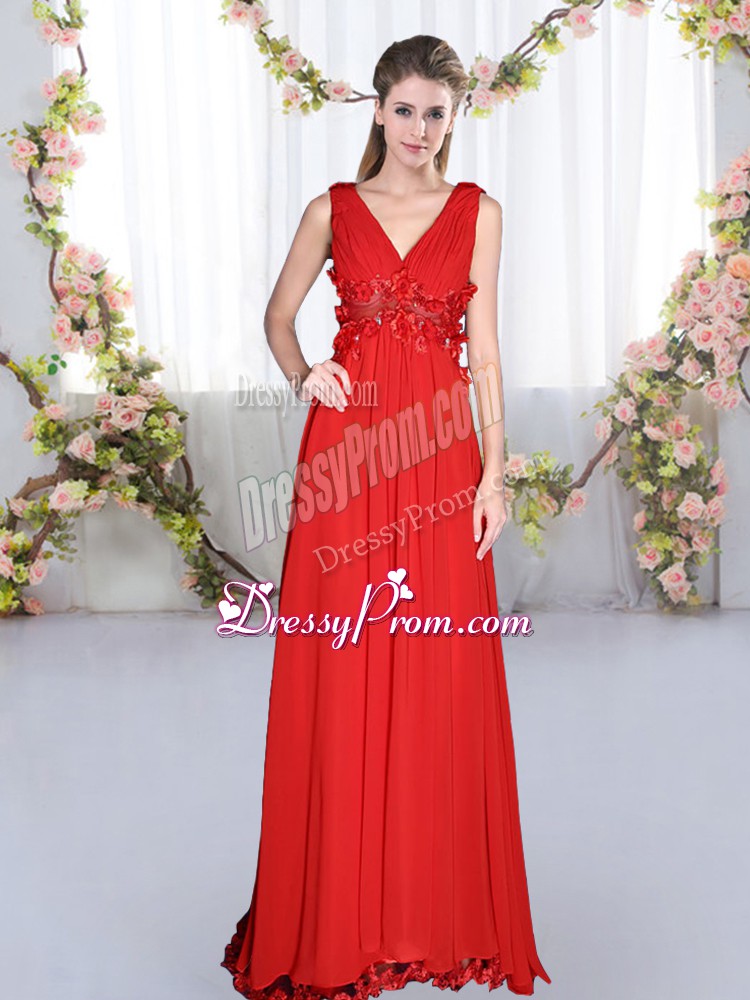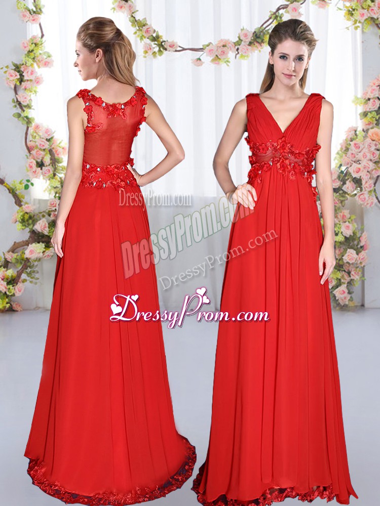 Neckline : V-neckShown Color : RedSilhouette : EmpireSleeve Length : sleevelessHemline : floor lengthBack Detail : Side zipperFabric : ChiffonEmbellishment : Beading,AppliquesOccasion : Prom,Party,Wedding PartySeason : Spring,Summer,Fall,Winter