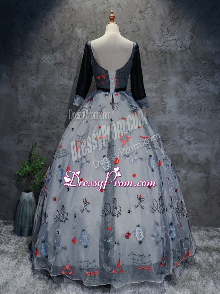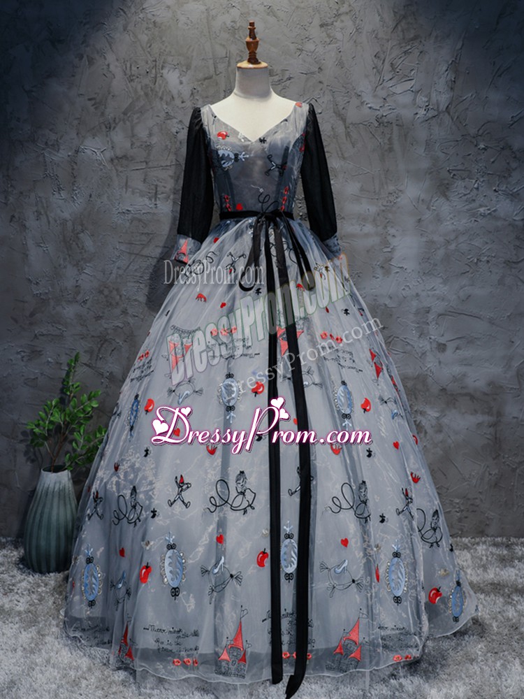 Neckline : V-neckShown Color : GreySilhouette : Ball GownsSleeve Length : 3|4 length sleeveHemline : floor lengthBack Detail : Lace upFabric : PrintedEmbellishment : BeltOccasion : Military Ball,Sweet 16,QuinceaneraSeason : Spring,Summer,Fall,Winter
