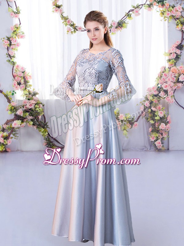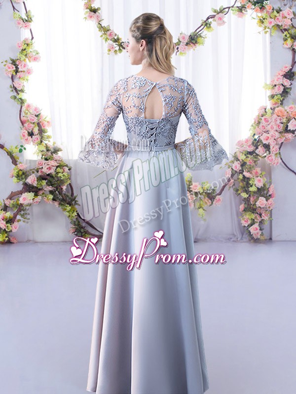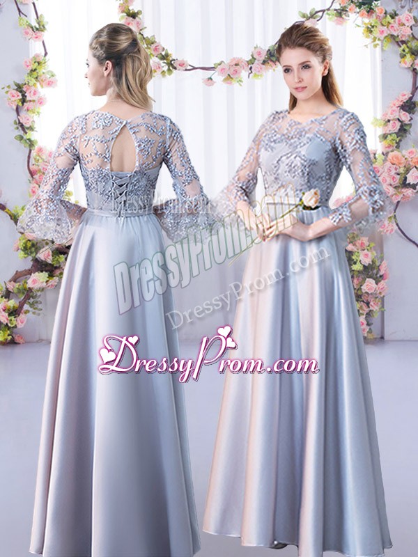 Neckline : ScoopShown Color : SilverSilhouette : A-lineSleeve Length : 3|4 length sleeveHemline : floor lengthBack Detail : Lace upFabric : SatinEmbellishment : LaceOccasion : Prom,Party,Wedding PartySeason : Spring,Summer,Fall,Winter