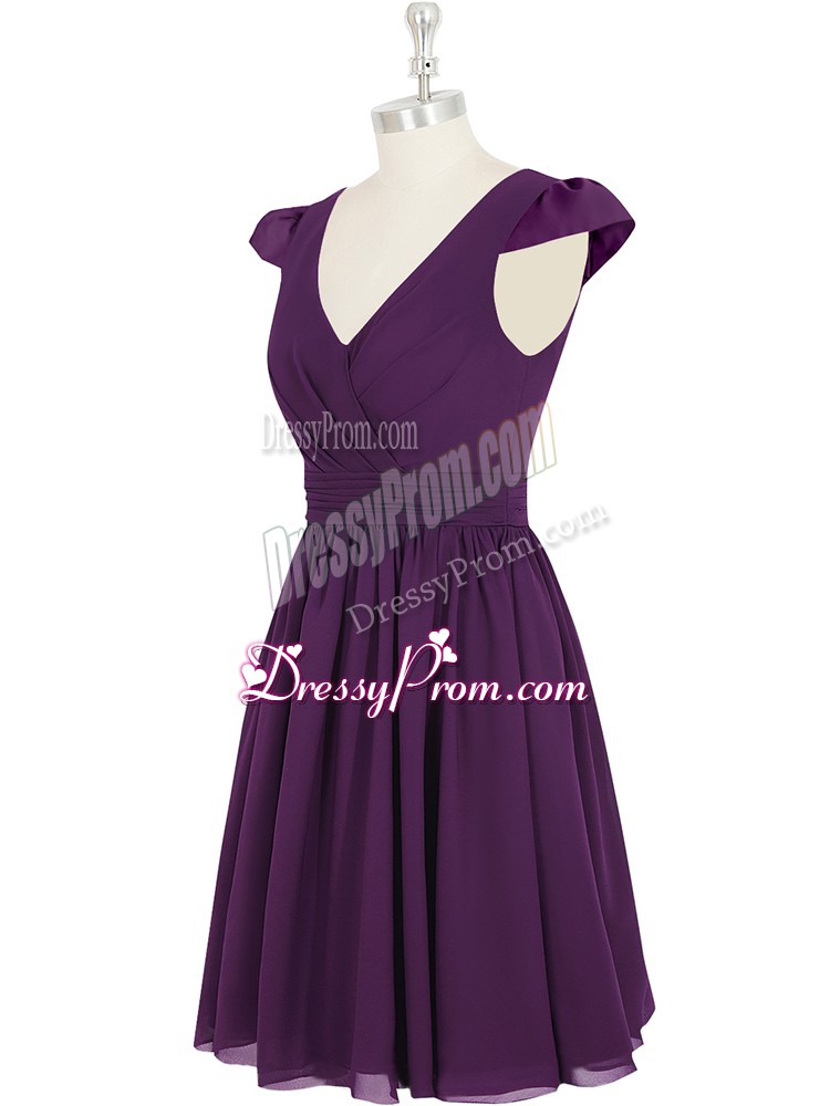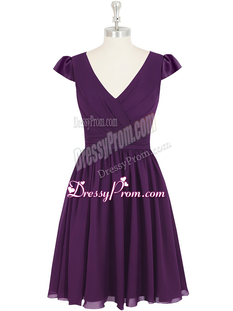 Neckline : V-neckShown Color : PurpleSilhouette : EmpireSleeve Length : cap sleevesHemline : mini lengthBack Detail : ZipperFabric : ChiffonEmbellishment : RuchingOccasion : Prom,Party,Wedding PartySeason : Spring,Summer,Fall