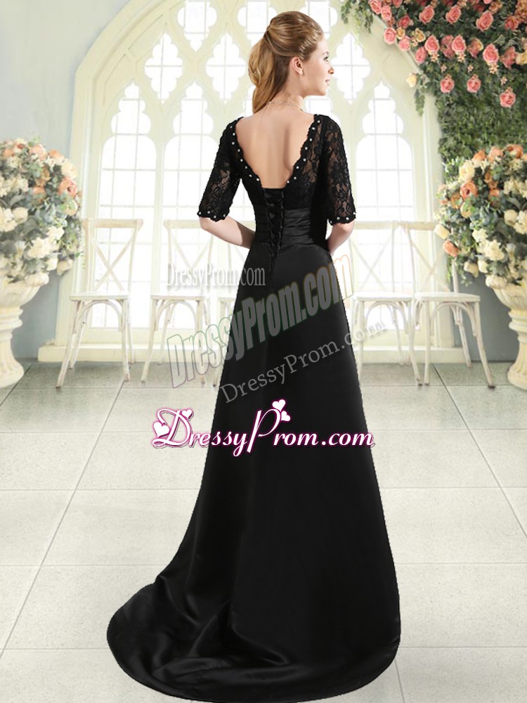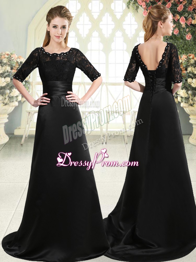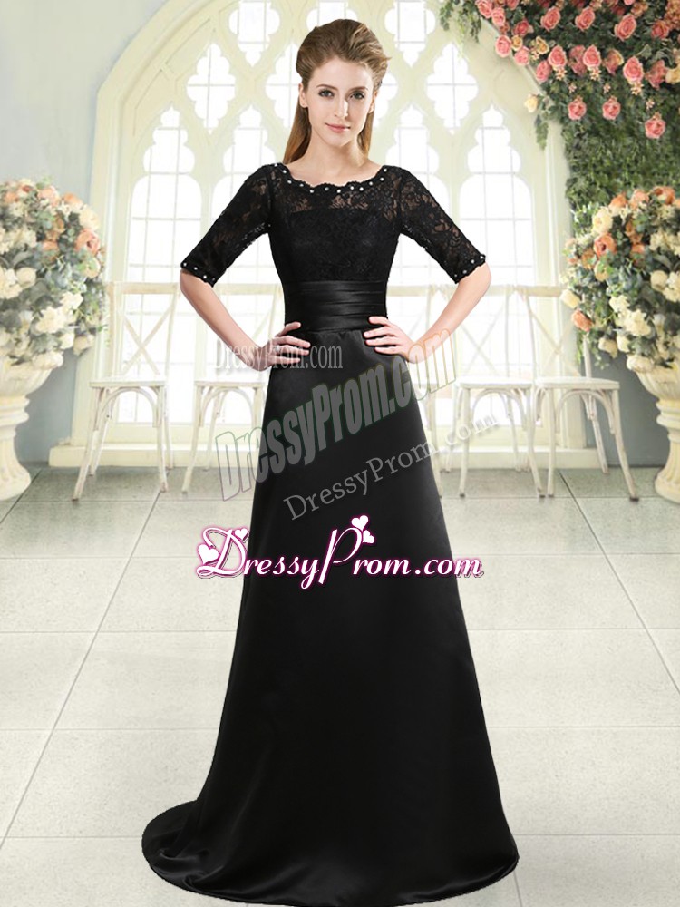 Neckline : ScallopedShown Color : BlackSilhouette : A-lineSleeve Length : half sleevesBack Detail : Lace upFabric : Elastic Woven SatinEmbellishment : Beading,AppliquesOccasion : Prom,PartySeason : Spring,Summer,Fall,Winter