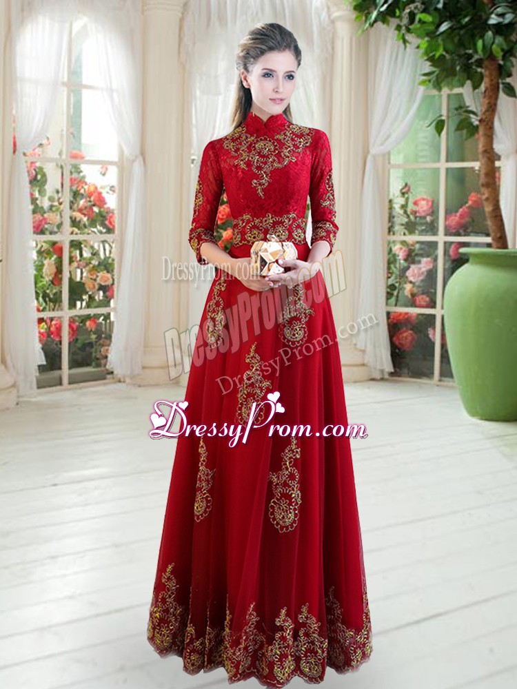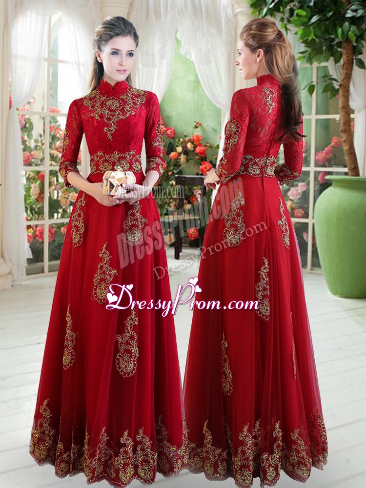 Neckline : High-neckShown Color : Wine RedSilhouette : EmpireSleeve Length : 3|4 length sleeveHemline : floor lengthBack Detail : ZipperFabric : TulleEmbellishment : LaceOccasion : Prom,PartySeason : Spring,Summer,Fall,Winter
