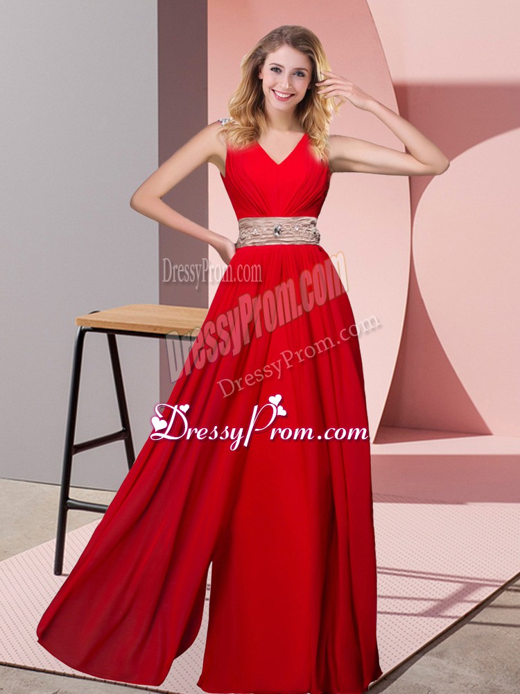 Neckline : V-neckShown Color : RedSilhouette : Column/SheathSleeve Length : sleevelessHemline : floor lengthBack Detail : Lace upFabric : ChiffonEmbellishment : BeadingOccasion : Prom,Party,Military BallSeason : Spring,Summer,Fall,Winter