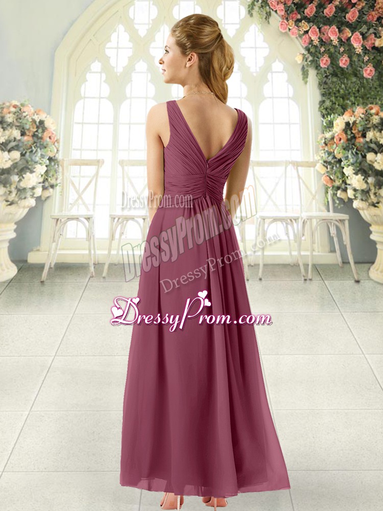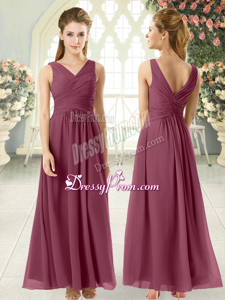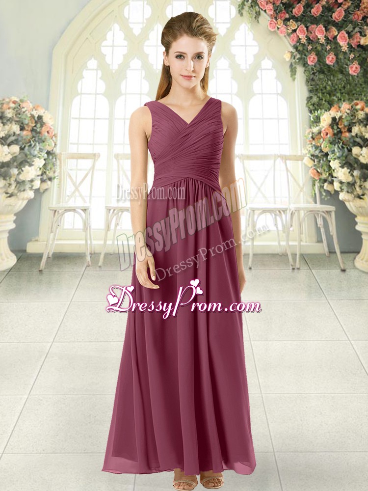 Neckline : V-neckShown Color : BurgundySilhouette : EmpireSleeve Length : sleevelessHemline : ankle lengthBack Detail : ZipperFabric : ChiffonEmbellishment : RuchingOccasion : Prom,PartySeason : Spring,Summer,Fall,Winter