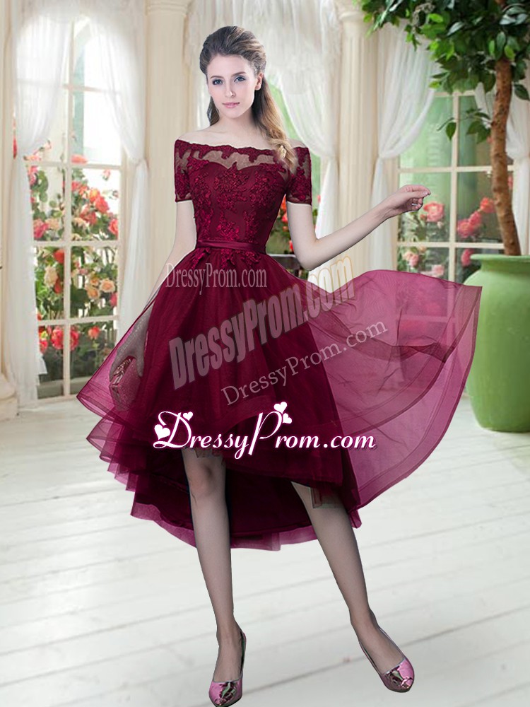 Neckline : Off the shoulder Shown Color : Burgundy Silhouette : A-line Sleeve Length : short sleeves Hemline : high low Back Detail : Lace up Fabric : Tulle Embellishment : Lace Occasion : Prom,Party Season : Spring,Summer,Fall,Winter