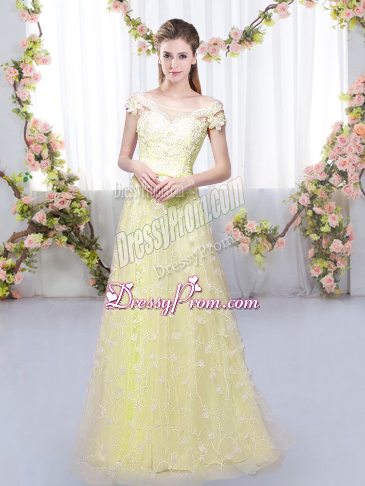 Neckline : Off the shoulder Shown Color : Light Yellow Silhouette : Empire Sleeve Length : cap sleeves Hemline : floor length Back Detail : Lace up Fabric : Tulle Embellishment : Appliques Occasion : Prom,Party,Wedding Party Season : Spring,Summer,Fall,Winter