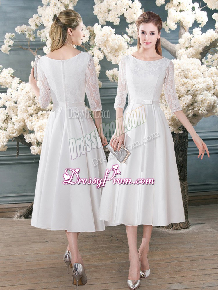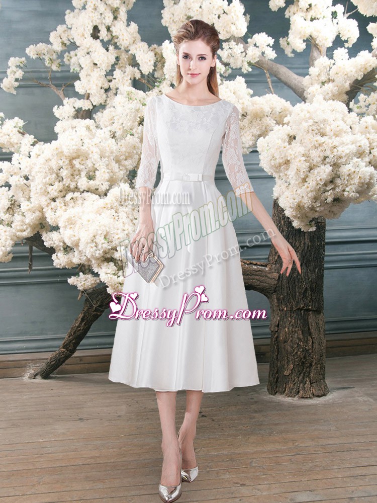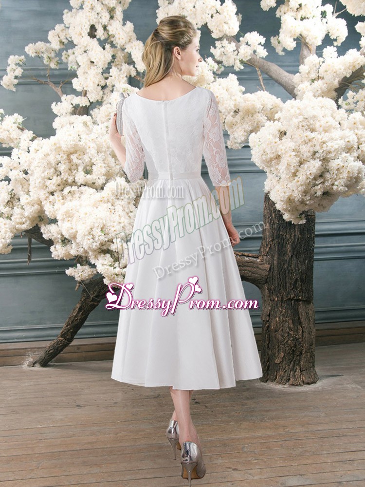 Neckline : ScoopShown Color : WhiteSilhouette : A-lineSleeve Length : 3|4 length sleeveHemline : tea lengthBack Detail : ZipperFabric : SatinEmbellishment : LaceOccasion : Prom,PartySeason : Spring,Summer,Fall,Winter