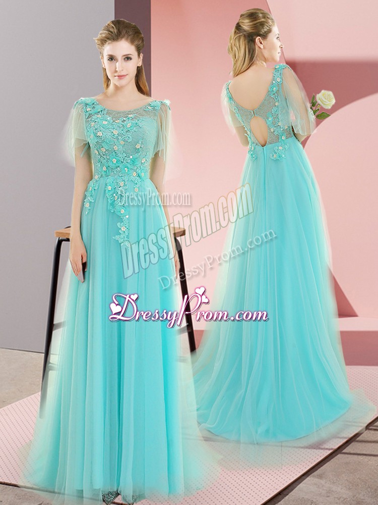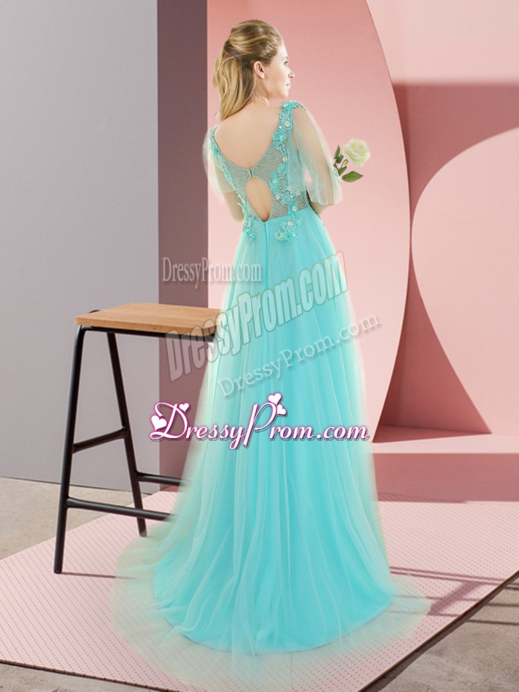 Neckline : ScoopShown Color : Aqua BlueSilhouette : EmpireSleeve Length : sleevelessBack Detail : BacklessFabric : TulleEmbellishment : AppliquesOccasion : Prom,Party,Military BallSeason : Spring,Summer,Fall,Winter