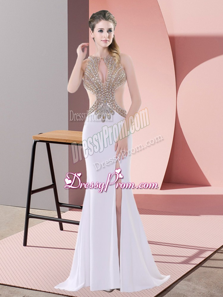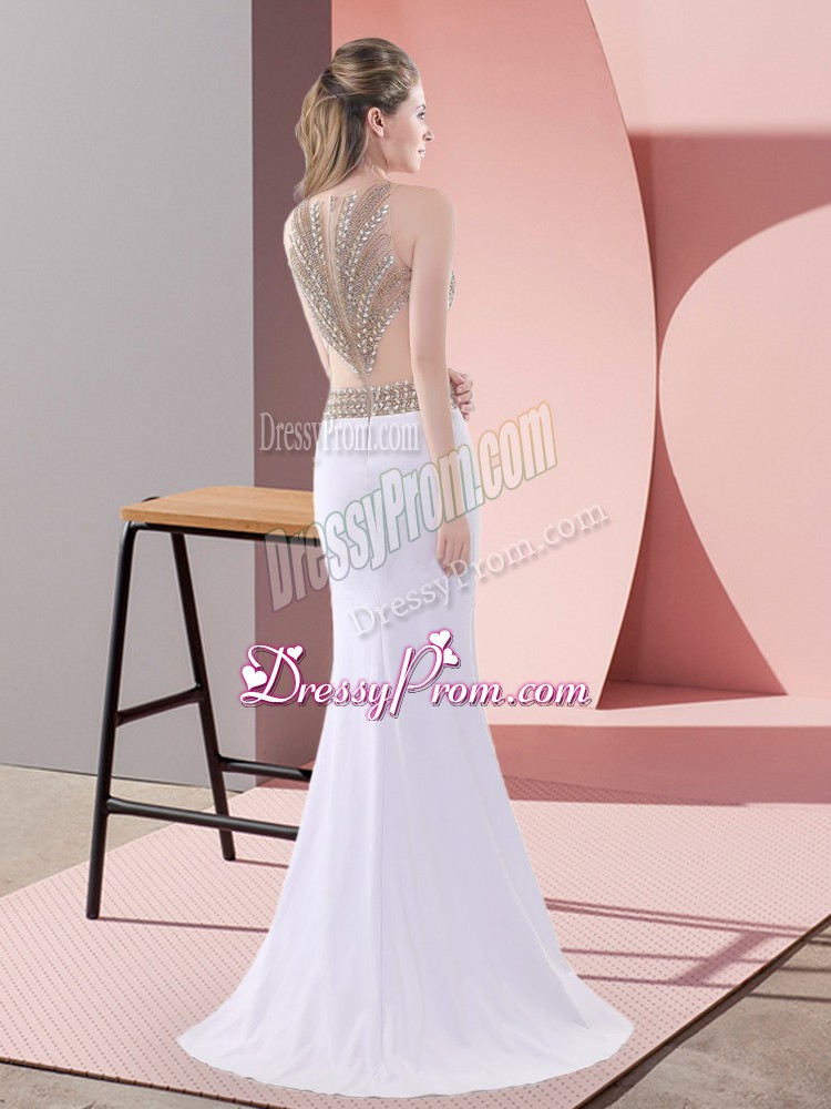 Neckline : ScoopShown Color : WhiteSilhouette : MermaidSleeve Length : sleevelessBack Detail : Lace upFabric : ChiffonEmbellishment : Beading,LaceOccasion : Prom,Party,Military BallSeason : Spring,Summer,Fall,Winter