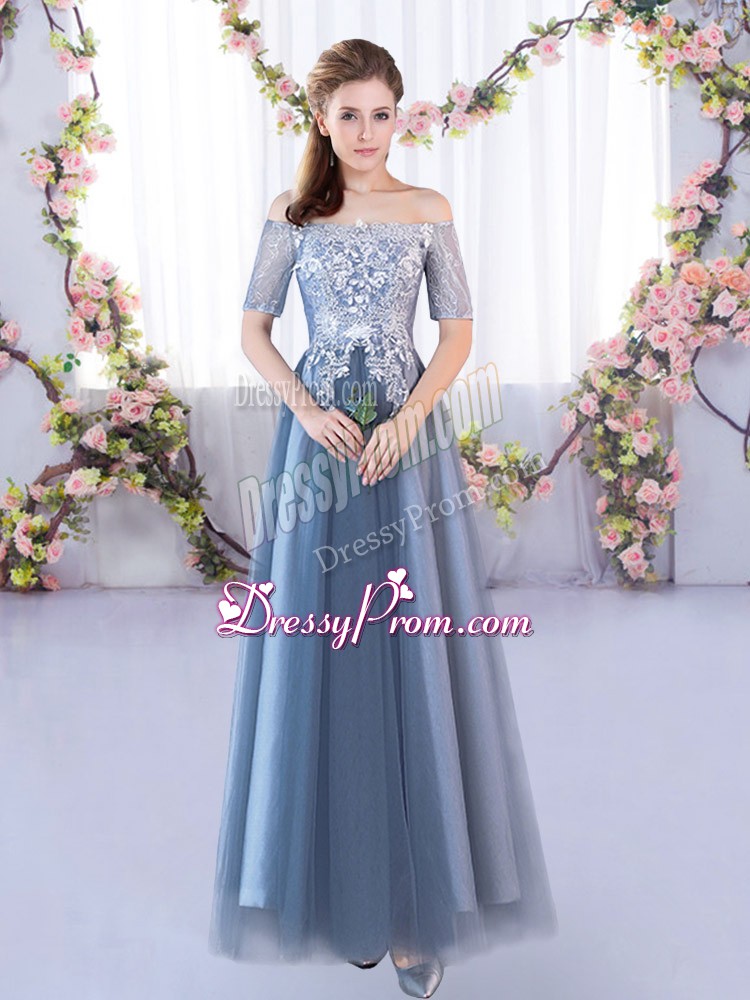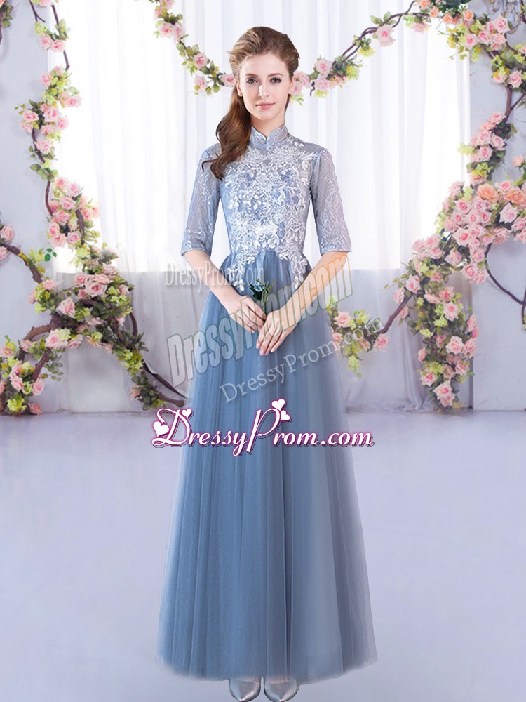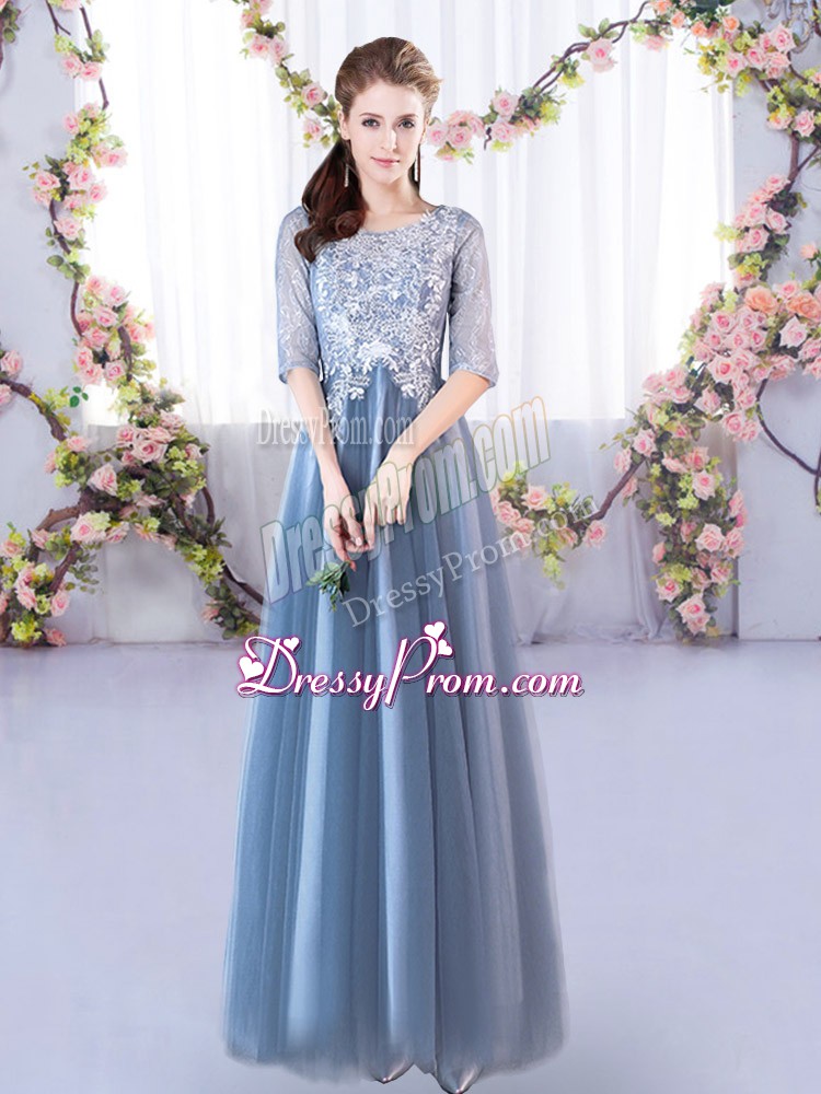 Blue Scoop Lace Up Lace Quinceanera Court Dresses Half Sleeves