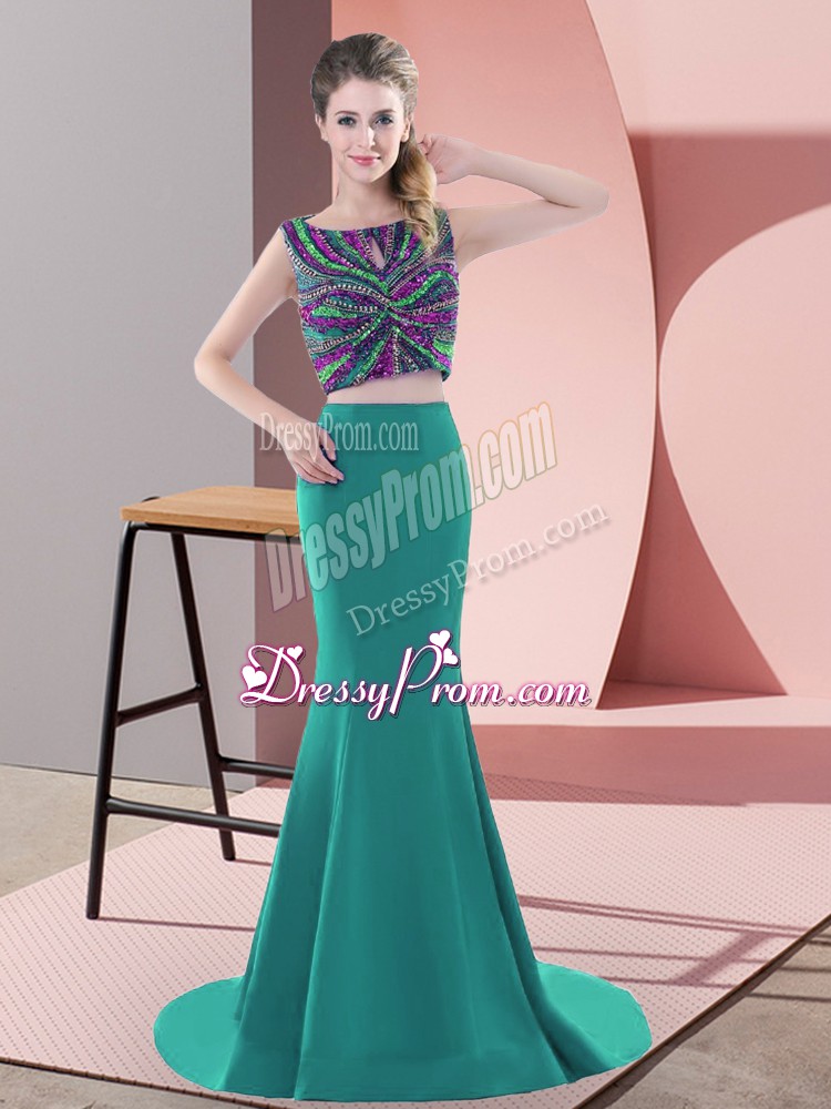 Neckline : ScoopShown Color : TurquoiseSilhouette : Two PiecesSleeve Length : sleevelessBack Detail : BacklessFabric : SatinEmbellishment : BeadingOccasion : Prom,PartySeason : Spring,Summer,Fall,Winter