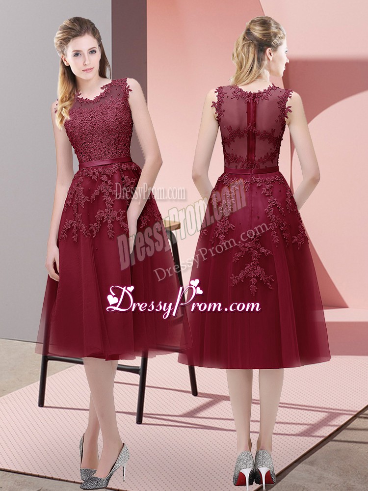 Neckline : V-neckShown Color : BurgundySilhouette : A-lineSleeve Length : sleevelessHemline : tea lengthBack Detail : Lace upFabric : TulleEmbellishment : Beading,Lace,AppliquesOccasion : Prom,PartySeason : Spring,Summer,Fall,Winter