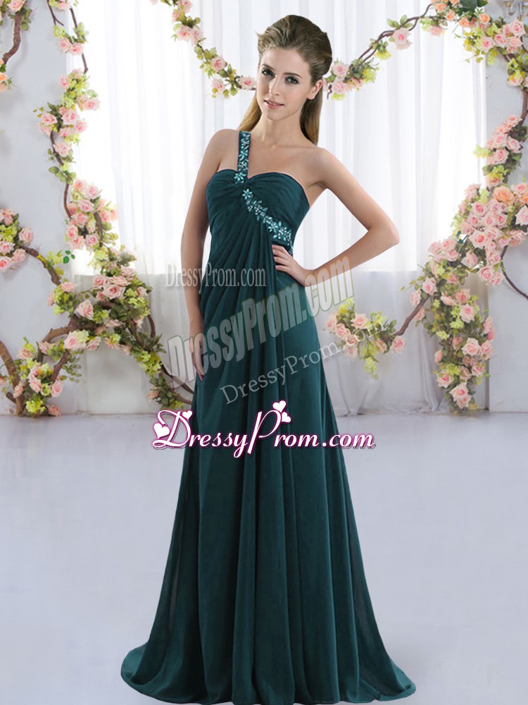 Neckline : One shoulderShown Color : Peacock GreenSilhouette : EmpireSleeve Length : sleevelessBack Detail : Lace upFabric : ChiffonEmbellishment : BeadingOccasion : Prom,PartySeason : Spring,Summer,Fall,Winter
