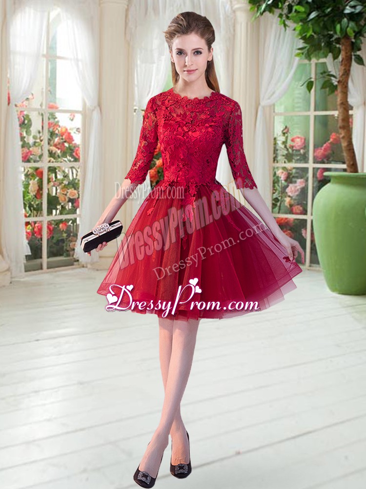 Neckline : ScallopedShown Color : Wine RedSilhouette : A-lineSleeve Length : half sleevesHemline : knee lengthBack Detail : ZipperFabric : TulleEmbellishment : LaceOccasion : Prom,PartySeason : Spring,Summer,Fall