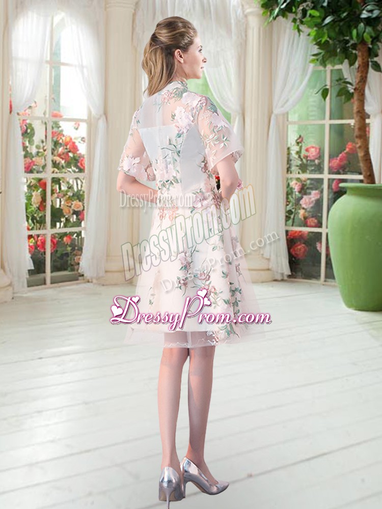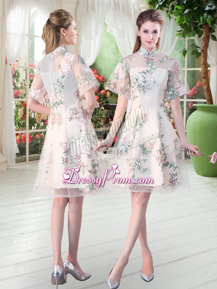 Neckline : High-neckShown Color : ChampagneSilhouette : A-lineSleeve Length : short sleevesHemline : knee lengthBack Detail : ZipperFabric : TulleEmbellishment : Appliques,EmbroideryOccasion : Prom,PartySeason : Spring,Summer,Fall