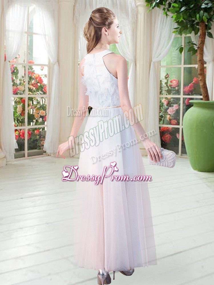 Neckline : ScoopShown Color : WhiteSilhouette : EmpireSleeve Length : sleevelessHemline : ankle lengthBack Detail : ZipperFabric : TulleEmbellishment : AppliquesOccasion : Prom,PartySeason : Spring,Summer,Fall,Winter