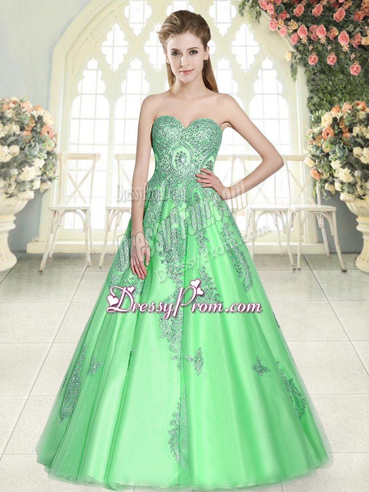 Neckline : SweetheartShown Color : GreenSilhouette : A-lineSleeve Length : sleevelessHemline : floor lengthBack Detail : Lace upFabric : TulleEmbellishment : AppliquesOccasion : Prom,PartySeason : Spring,Summer,Fall,Winter