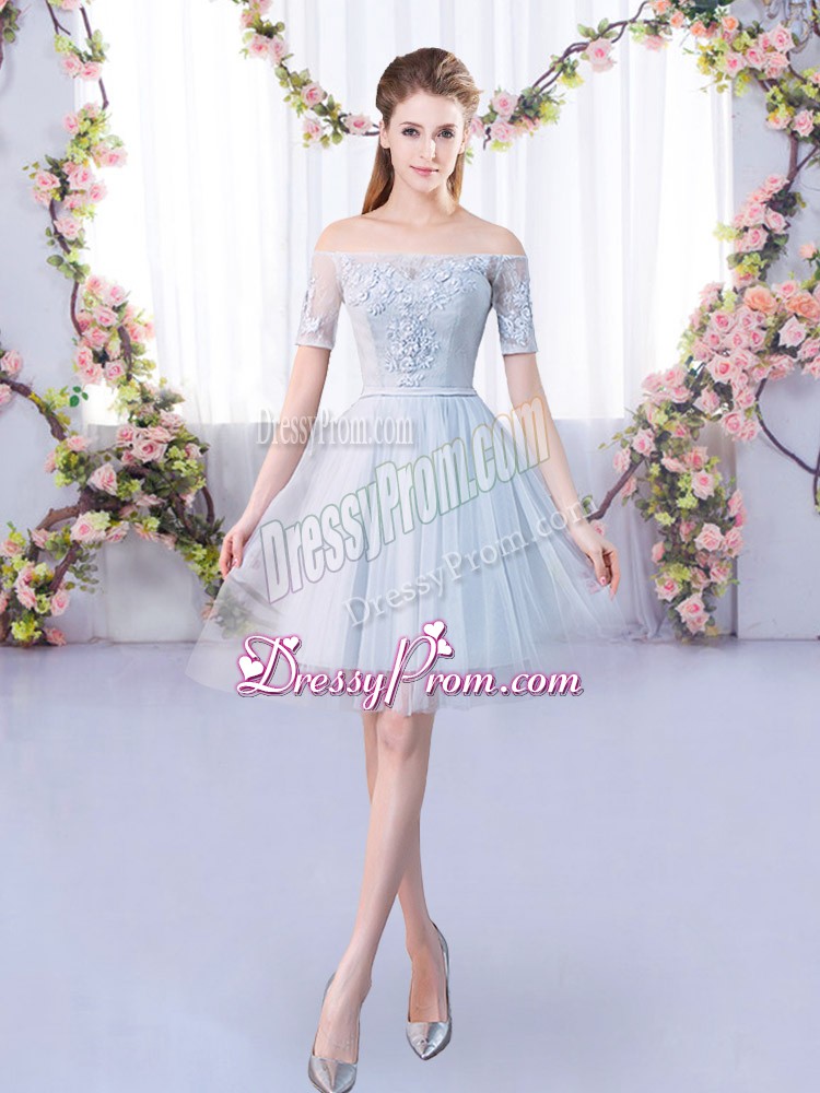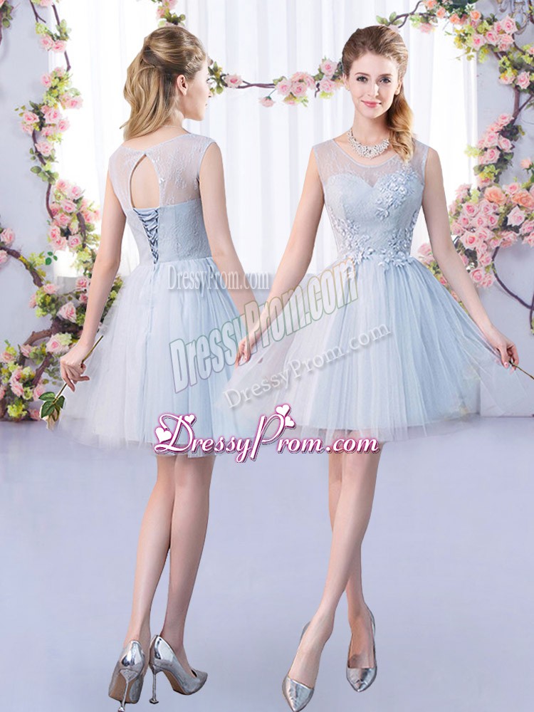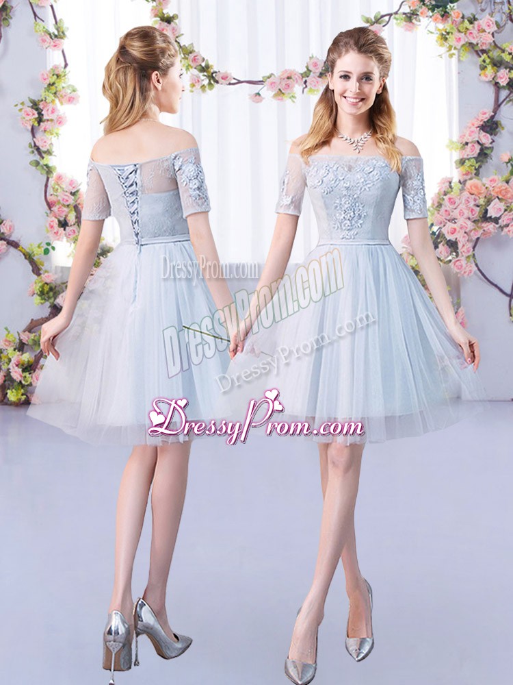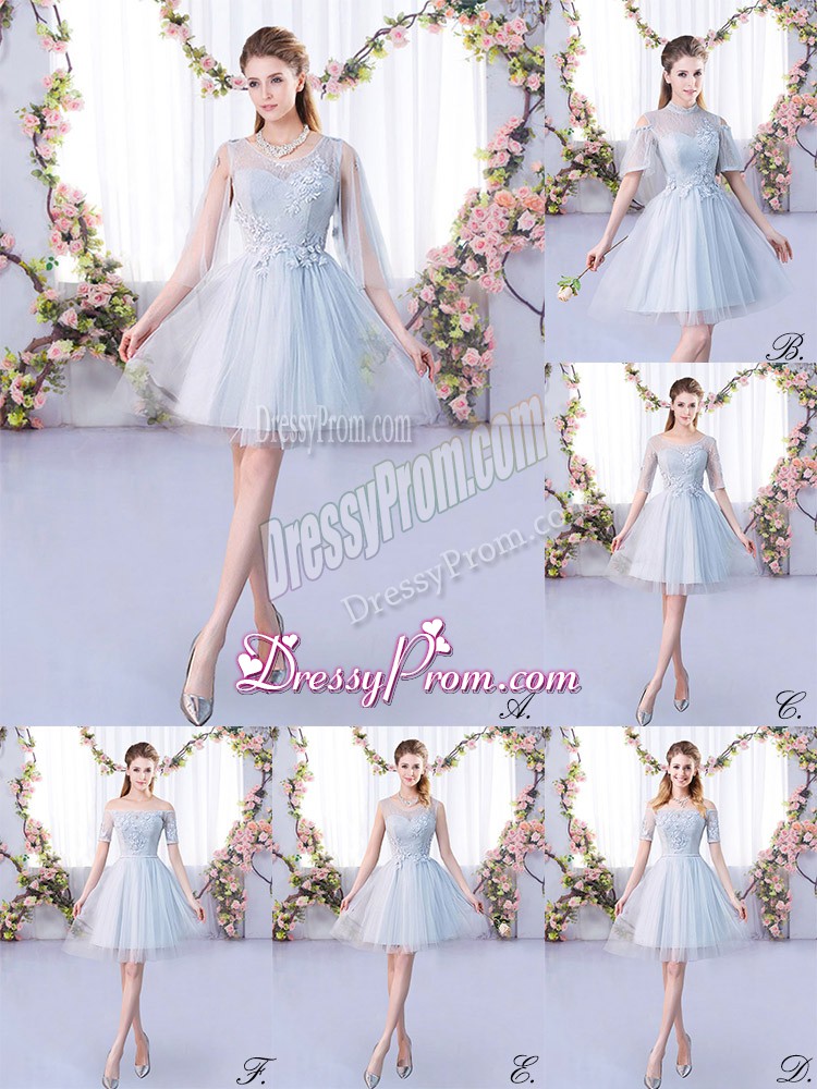 Neckline : ScoopShown Color : GreySilhouette : A-lineSleeve Length : 3|4 length sleeveHemline : mini lengthBack Detail : Lace upFabric : TulleEmbellishment : LaceOccasion : Prom,PartySeason : Spring,Summer,Fall
