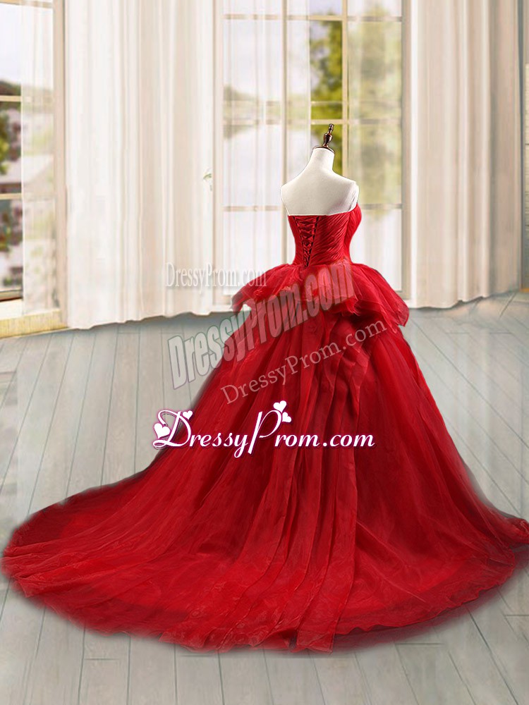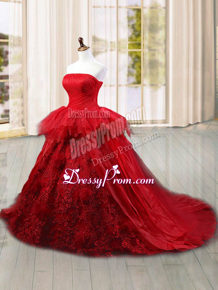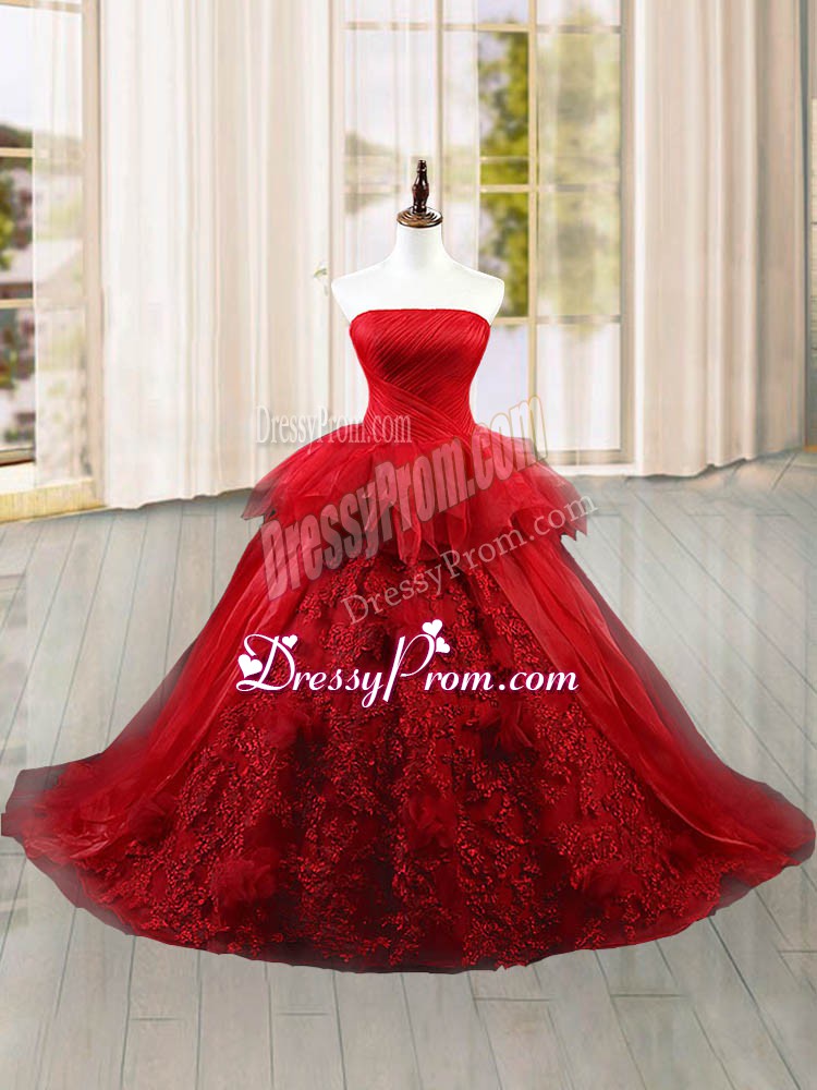 Neckline : StraplessShown Color : Wine RedSilhouette : Ball GownsSleeve Length : sleevelessBack Detail : Lace upFabric : TulleEmbellishment : Lace,RufflesOccasion : Military Ball,Sweet 16,QuinceaneraSeason : Spring,Summer,Fall,Winter