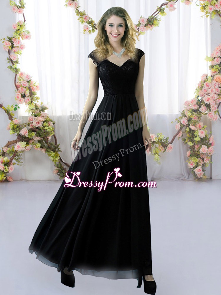 Neckline : V-neckShown Color : BlackSilhouette : EmpireSleeve Length : cap sleevesHemline : floor lengthBack Detail : ZipperFabric : ChiffonEmbellishment : LaceOccasion : Prom,Party,Wedding PartySeason : Spring,Summer,Fall,Winter