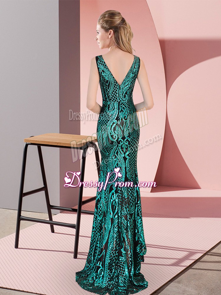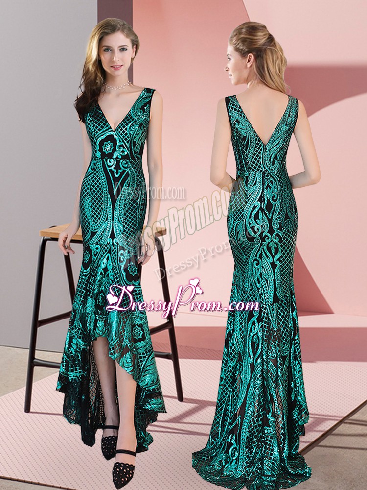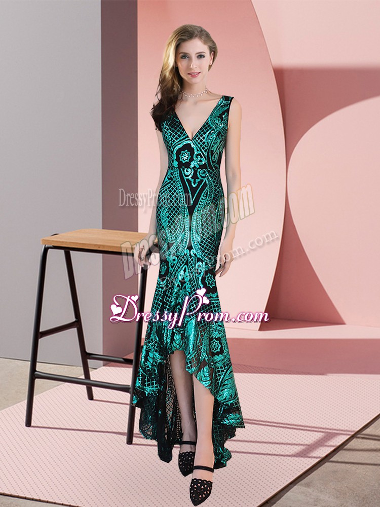 Neckline : V-neckShown Color : GreenSilhouette : MermaidSleeve Length : sleevelessHemline : high lowBack Detail : ZipperFabric : SequinedEmbellishment : RuchingOccasion : Prom,PartySeason : Spring,Summer,Fall,Winter