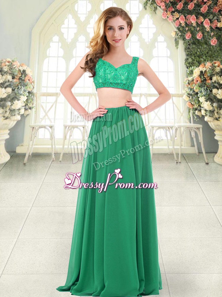 Neckline : StrapsShown Color : GreenSilhouette : Two PiecesSleeve Length : sleevelessHemline : floor lengthBack Detail : ZipperFabric : ChiffonEmbellishment : Beading,LaceOccasion : Prom,PartySeason : Spring,Summer,Fall,Winter