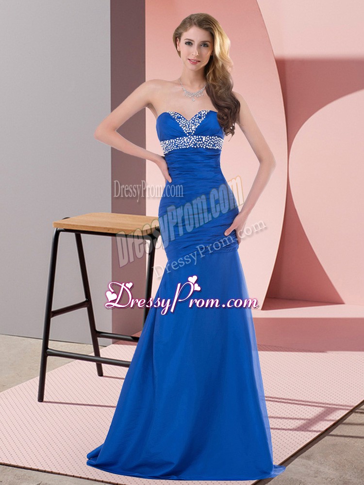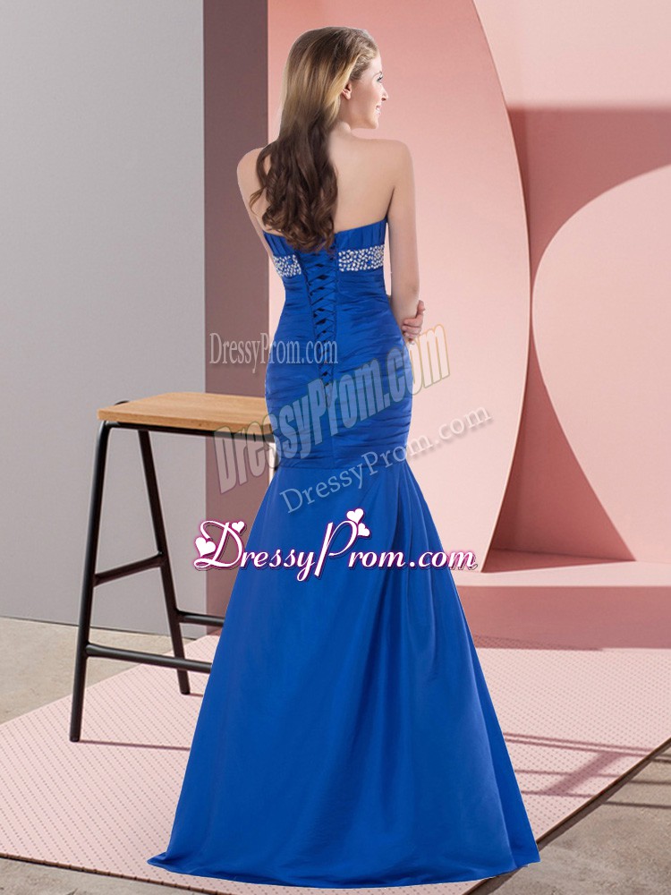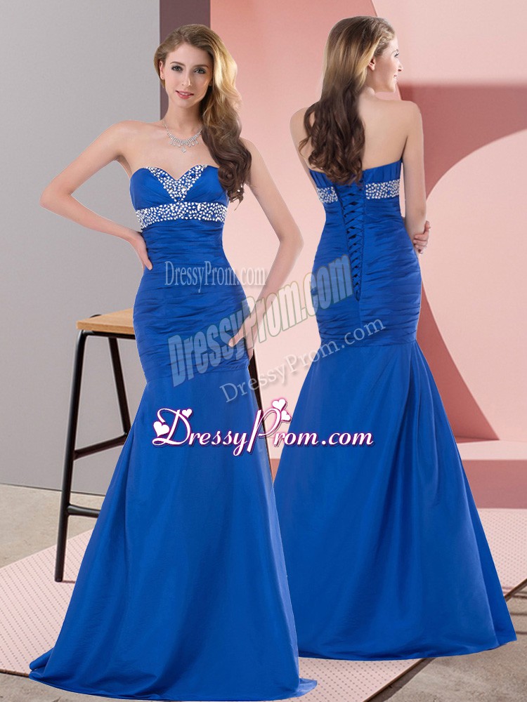 Neckline : SweetheartShown Color : BlueSilhouette : MermaidSleeve Length : sleevelessHemline : floor lengthBack Detail : Lace upFabric : SatinEmbellishment : Beading,RuchingOccasion : Prom,Party,Military BallSeason : Spring,Summer,Fall,Winter