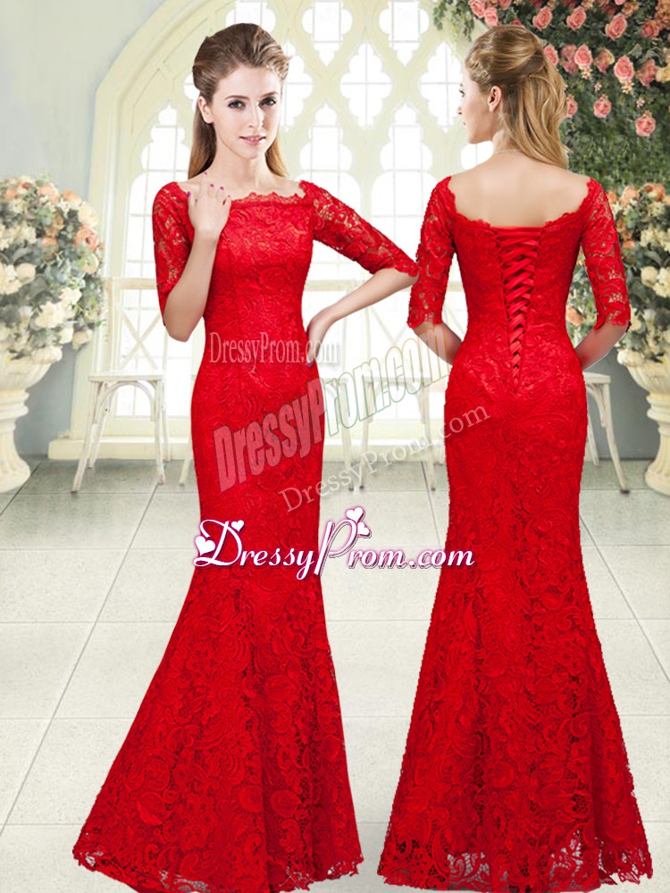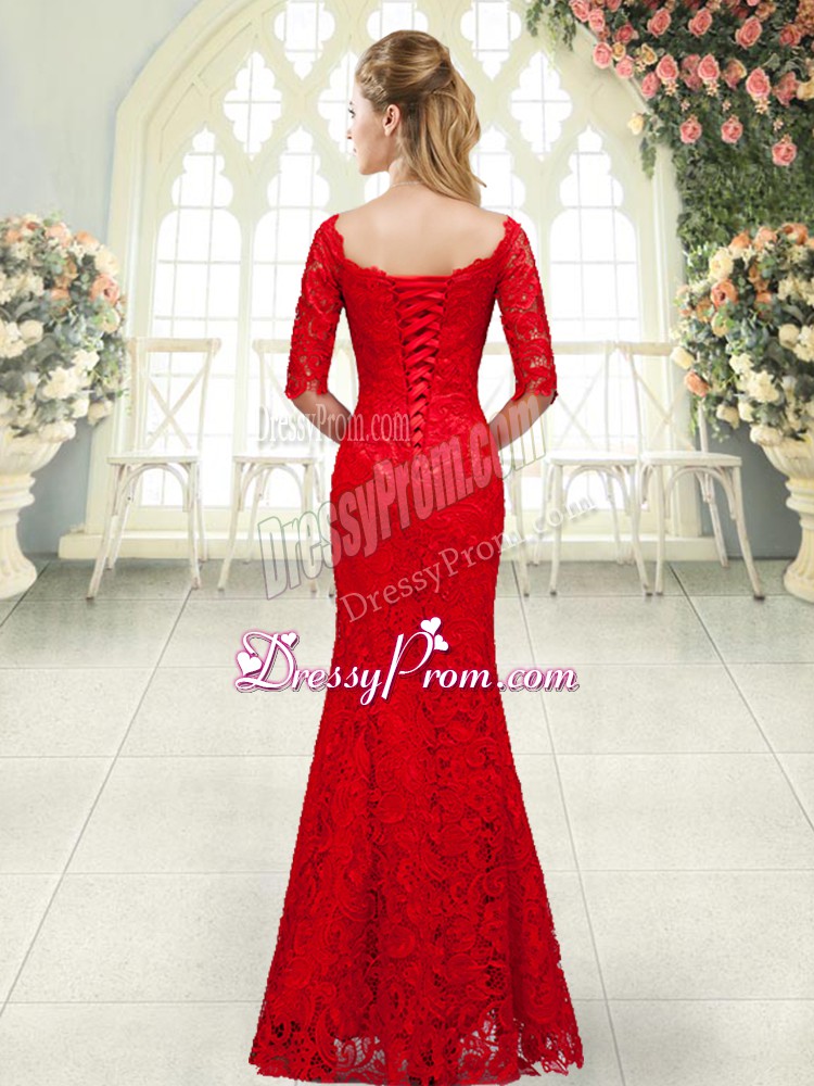 Neckline : ScallopedShown Color : RedSilhouette : MermaidSleeve Length : 3|4 length sleeveHemline : floor lengthBack Detail : Lace upFabric : LaceEmbellishment : BeadingOccasion : Prom,PartySeason : Spring,Summer,Fall,Winter