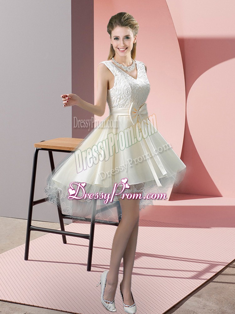 Neckline : V-neckShown Color : WhiteSilhouette : A-lineSleeve Length : sleevelessHemline : high lowBack Detail : Lace upFabric : TulleEmbellishment : Lace,BowknotOccasion : Prom,PartySeason : Spring,Summer,Fall,Winter