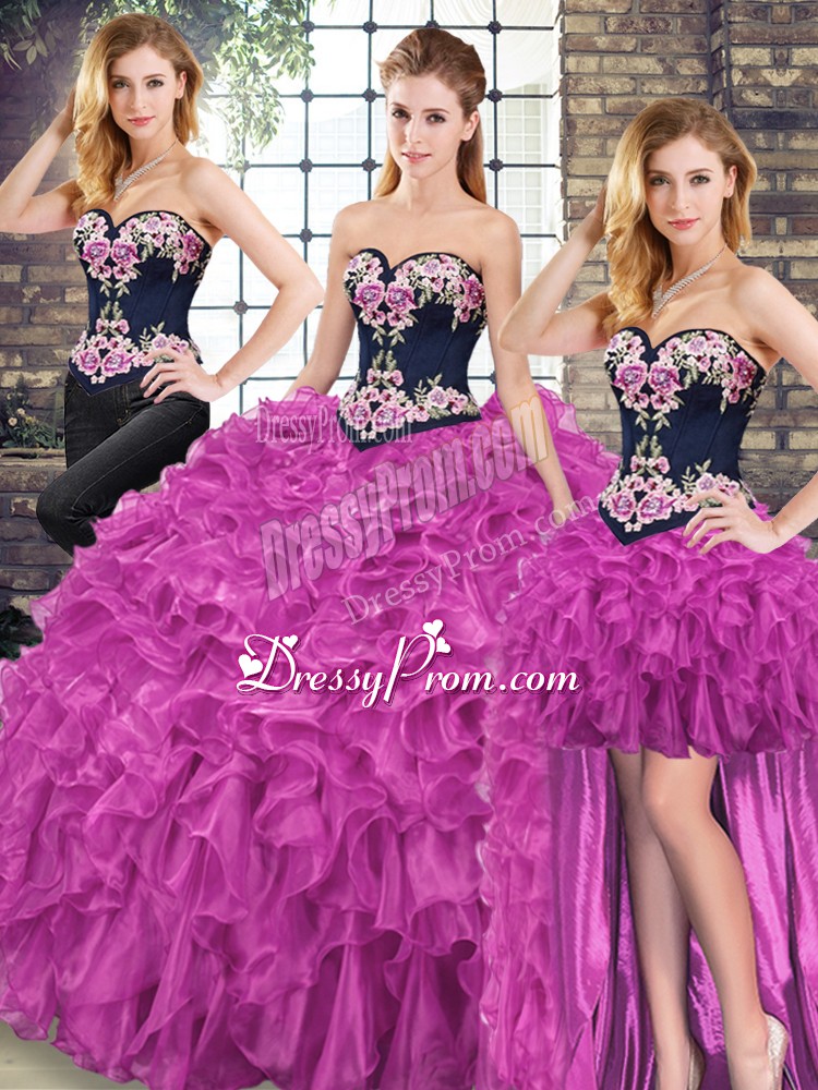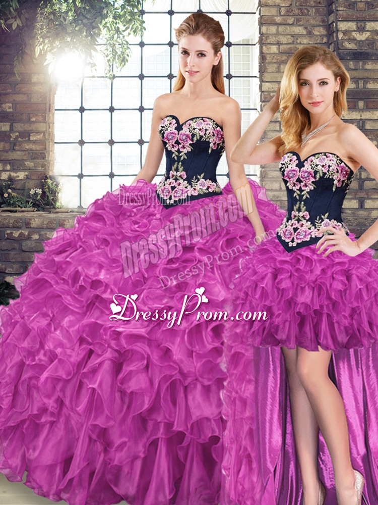 Neckline : SweetheartShown Color : FuchsiaSilhouette : Ball GownsSleeve Length : sleevelessBack Detail : Lace upFabric : OrganzaEmbellishment : Embroidery,RufflesOccasion : Military Ball,Sweet 16,QuinceaneraSeason : Spring,Summer,Fall,Winter